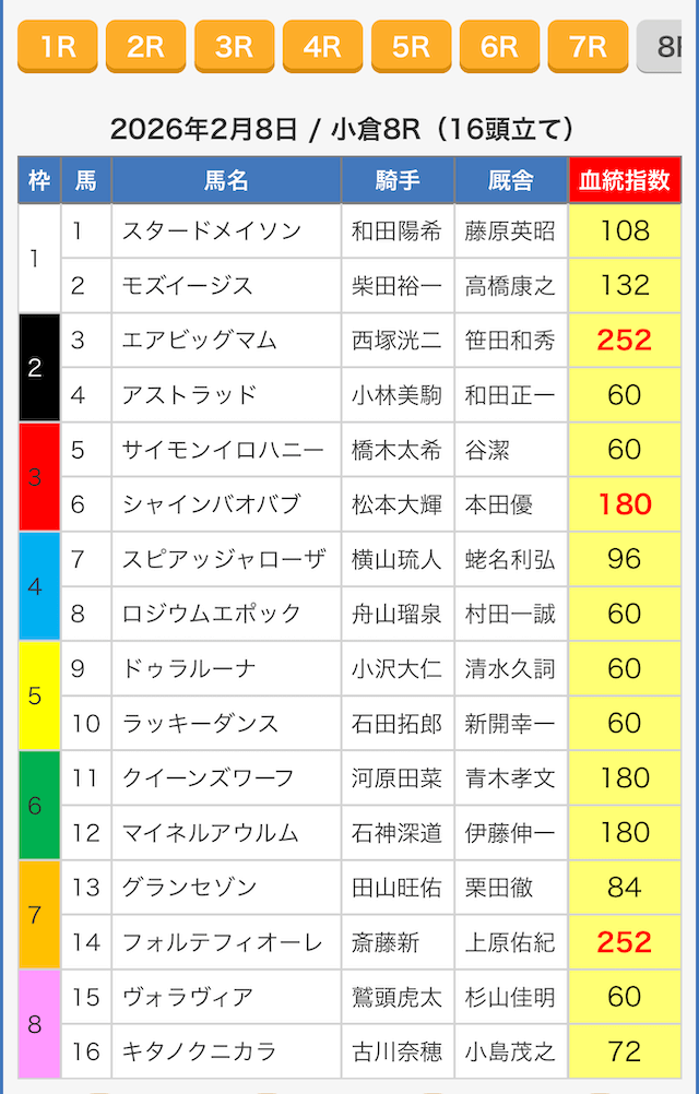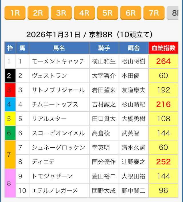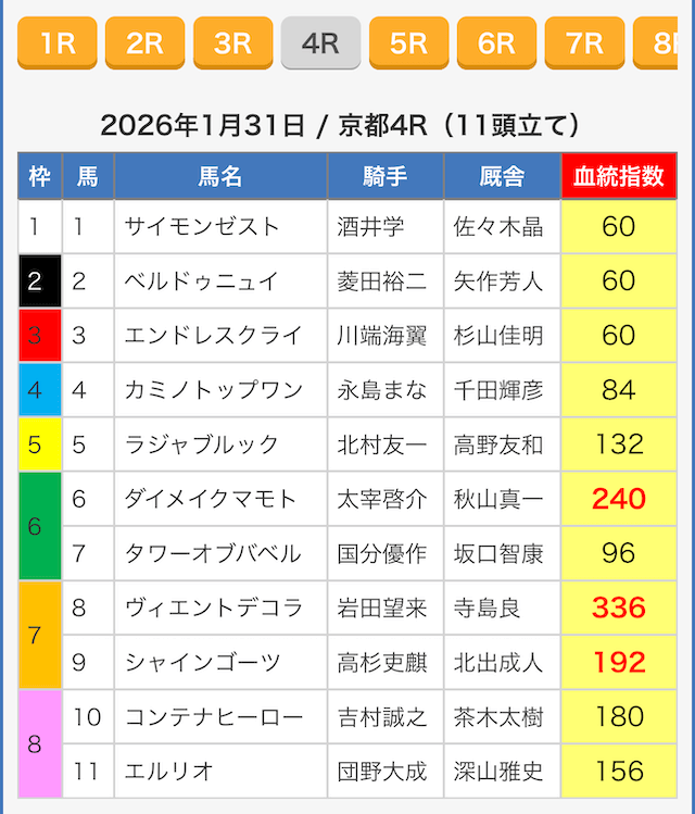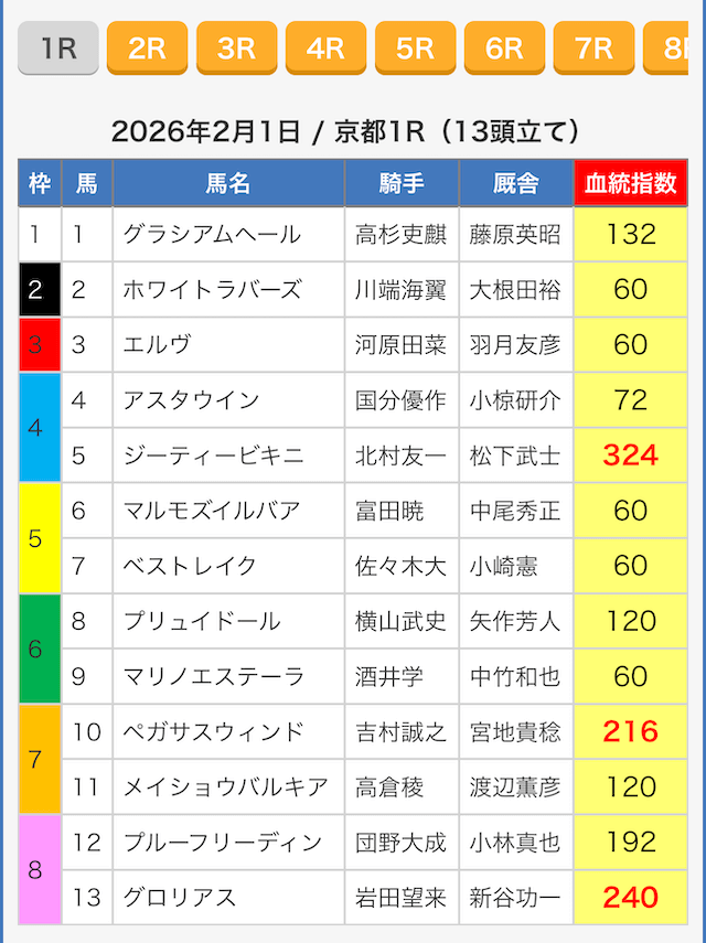 続いて、指数の根拠を探るべく出走表を見ていきましょう。
