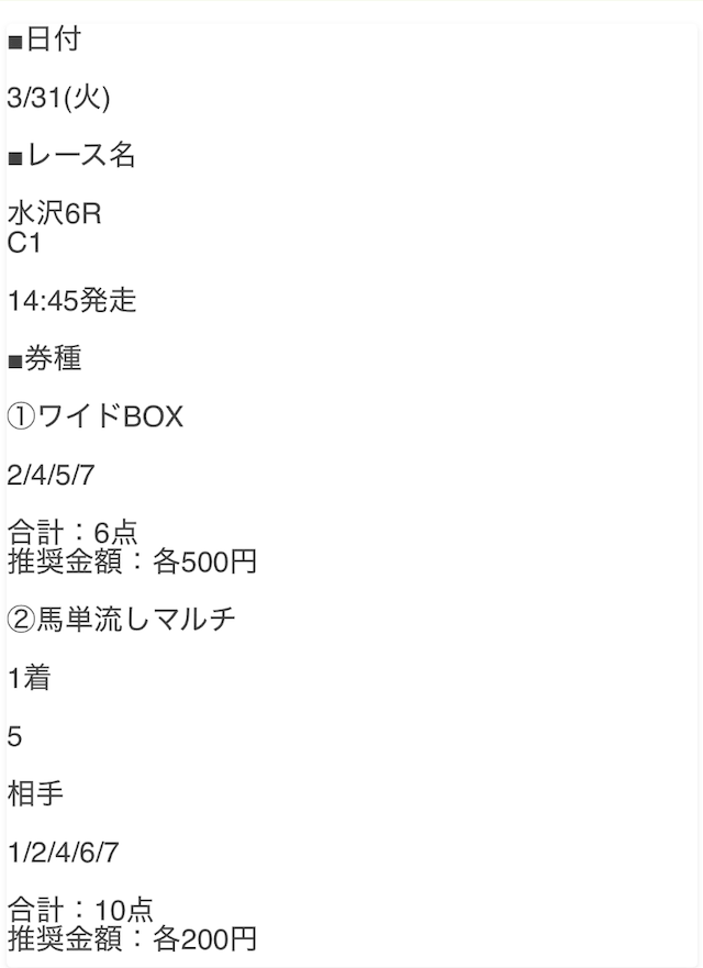指示通りに馬券を購入し、合計10,000円で勝負。