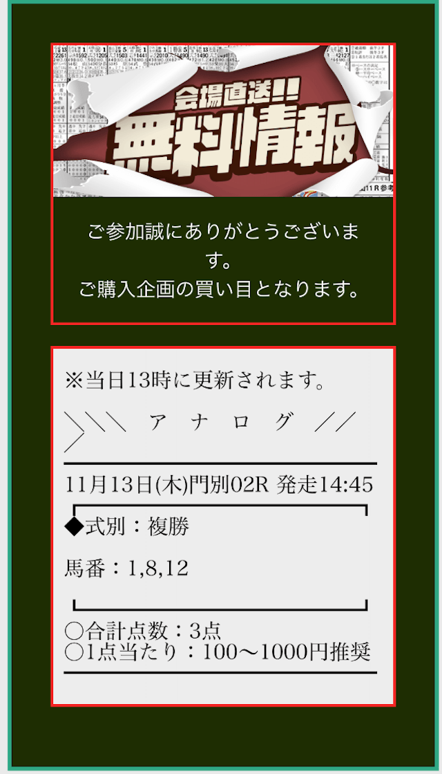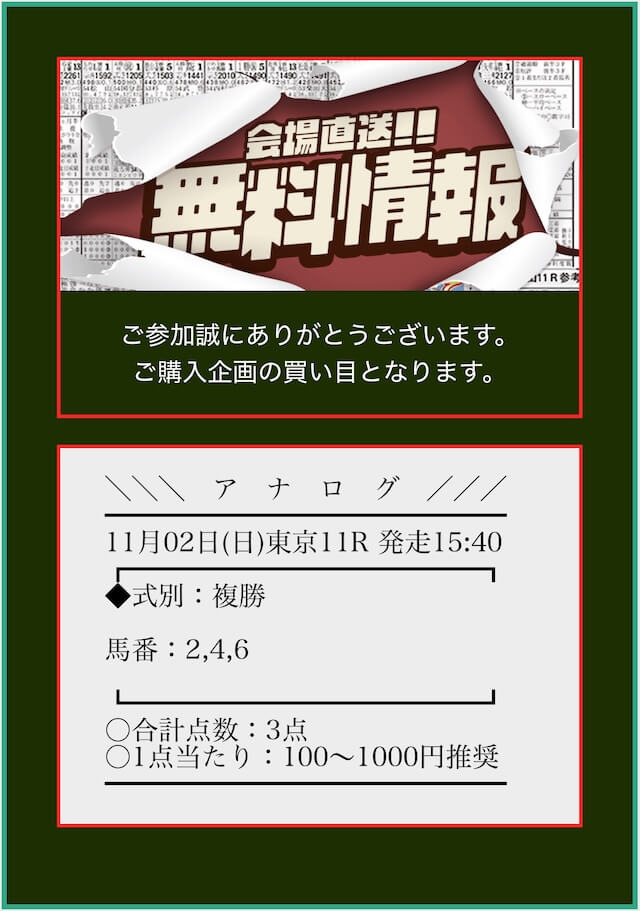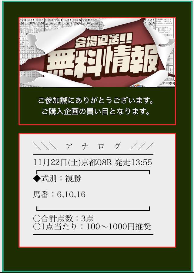 そもそも的中精度がありえんくらい高い情報に凄い安く参加できるのに、保証も付けてくれるのは太っ腹すぎる。