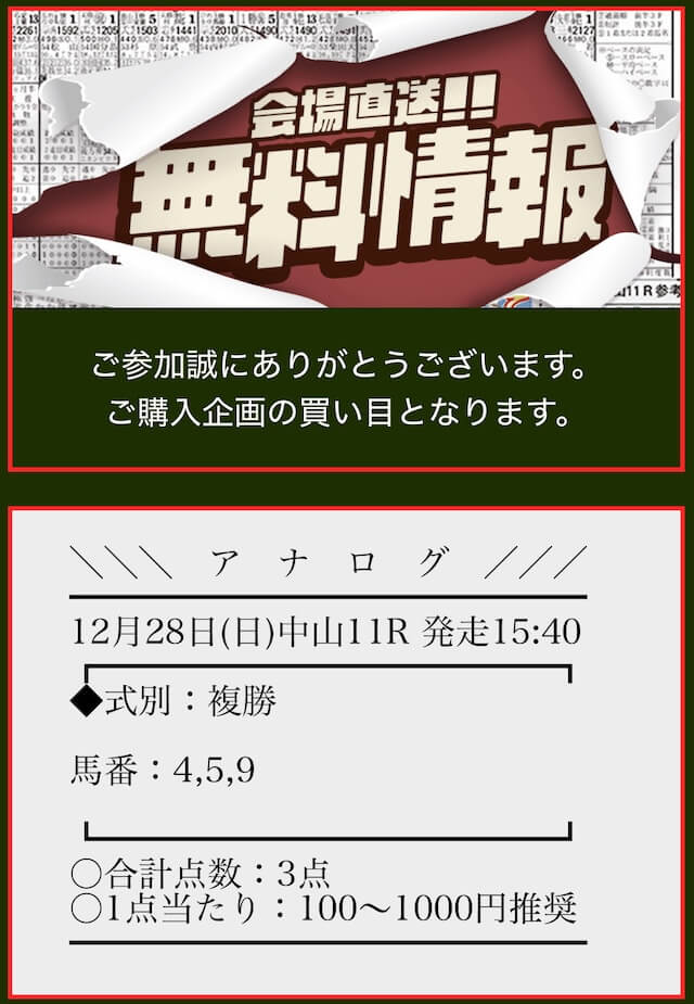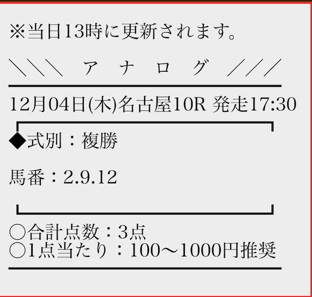 1戦目では、少ない点数でレースを読み切ったアナログの予想。