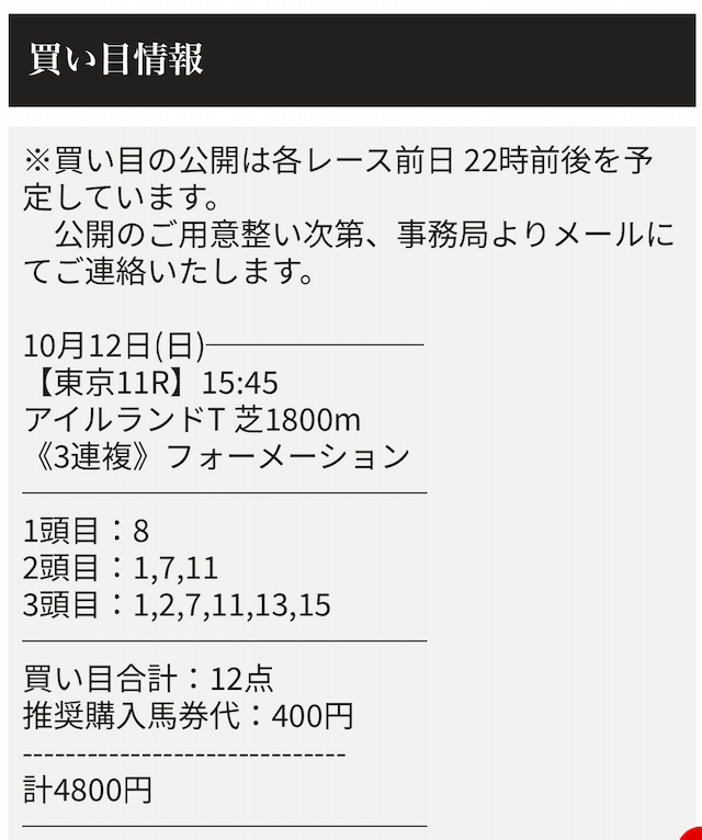 専属担当者がいるのは良いですね。予想提供して終わりではなく、その後のサポートまでついてくるなんて親切すぎる。