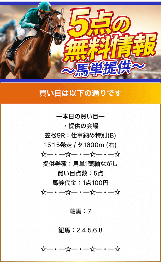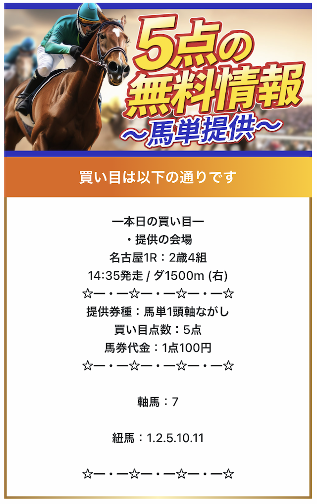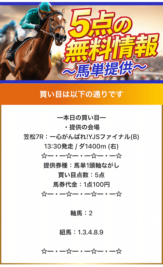 中央競馬だけでなく、平日の地方競馬も毎日1鞍公開してくれるのが楽しみです。仕事の休憩中にスマホでチェックして、お小遣いを稼ぐのが日課になりました。情報の質にムラがなく、地方でもしっかり利益を出してくれます。
