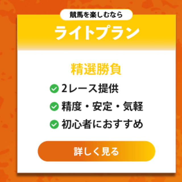 いきなり高いプランは怖いので「ライトプラン」から始めました。2レース提供で1レース的中でしたが、配当が良かったのでプラス収支。無理なく続けられそうです。サポート体制もしっかりしていて安心感があります。