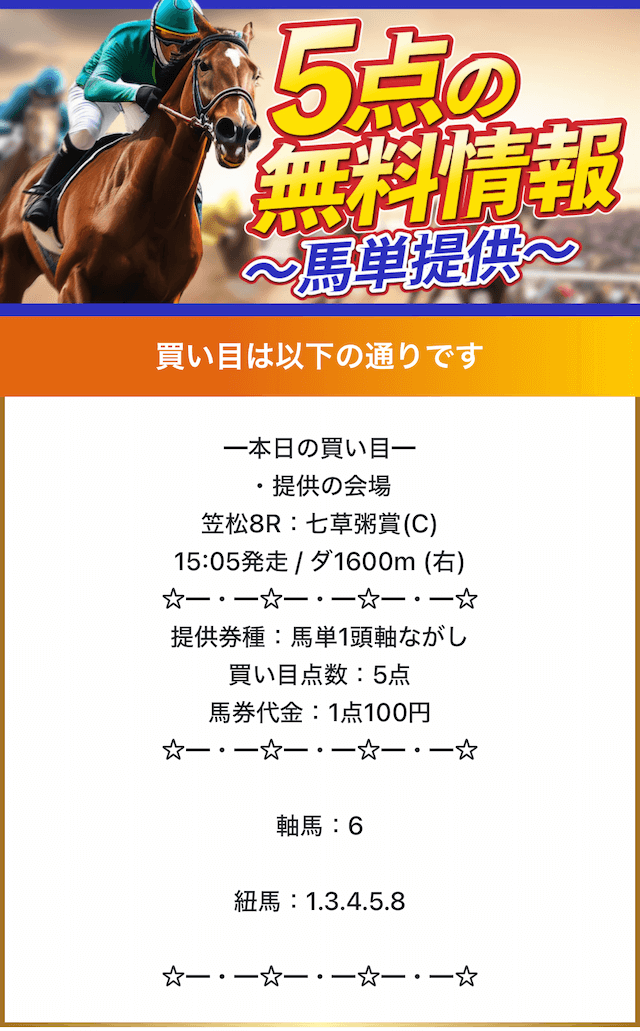 最初に見たときは、買い目が少なすぎて逆に不安になるレベル。でも試しにそのまま買ったら本当に的中。