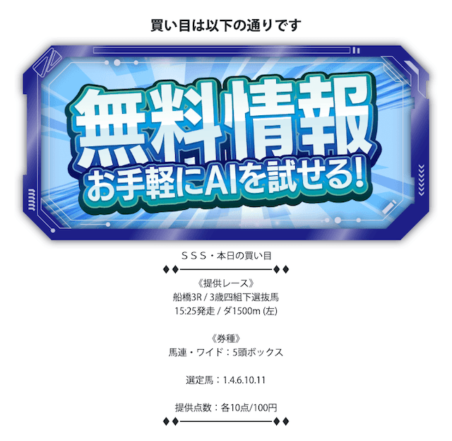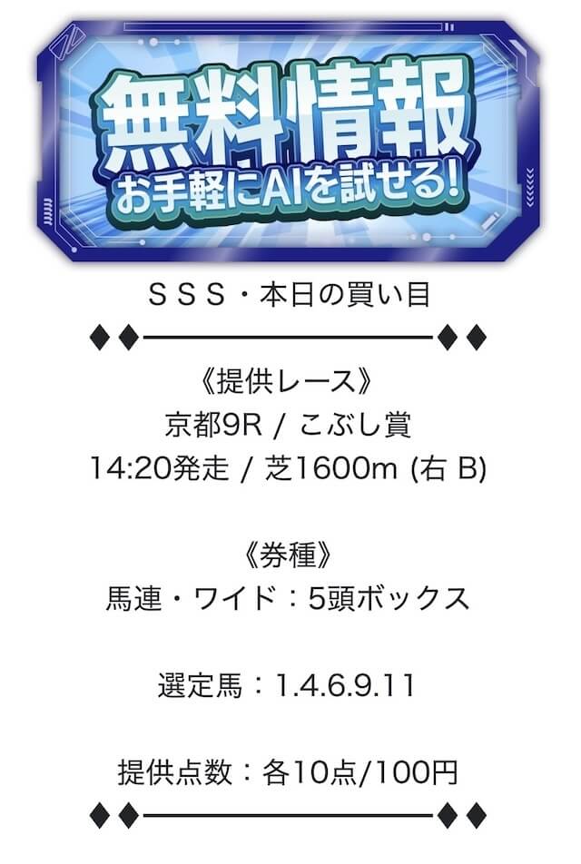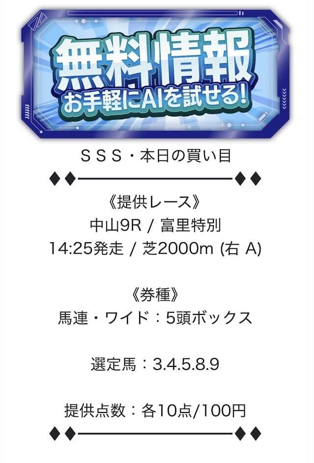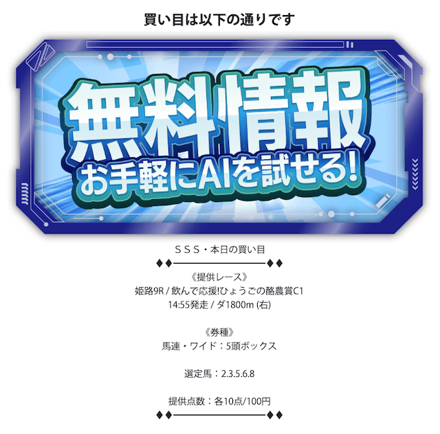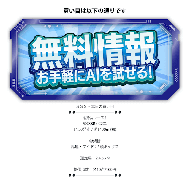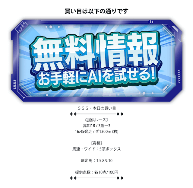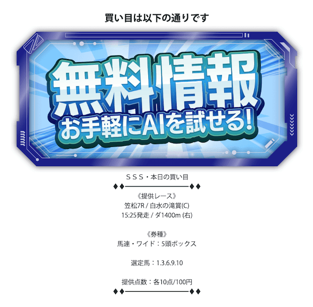 無料情報の的中精度が高い。ただ、配当は安いのでプラン参加の方が稼げる