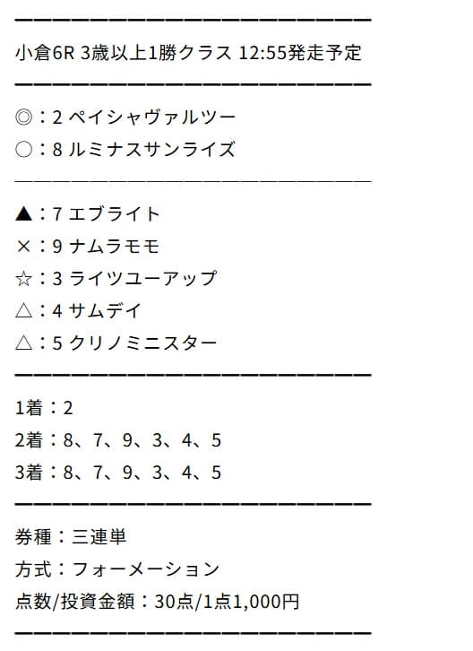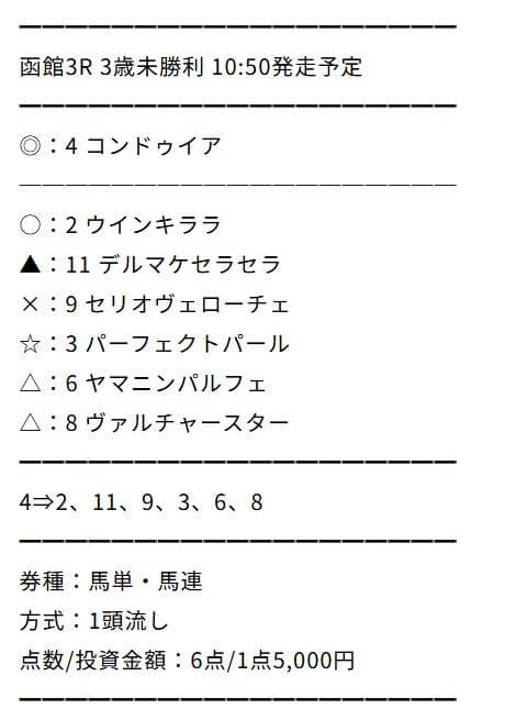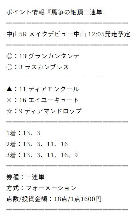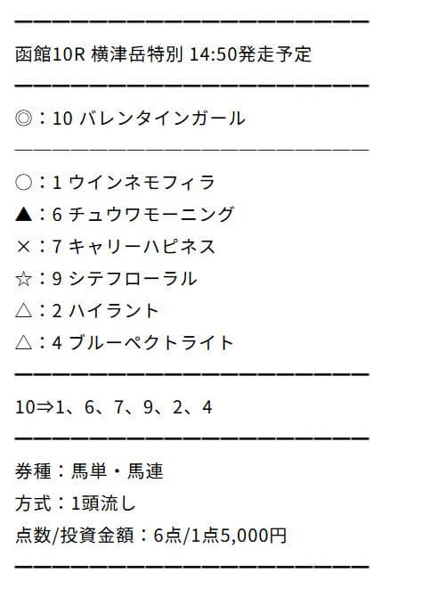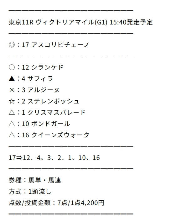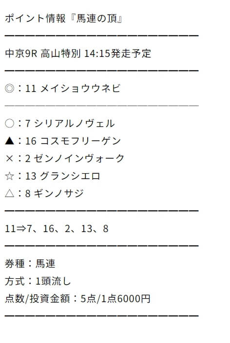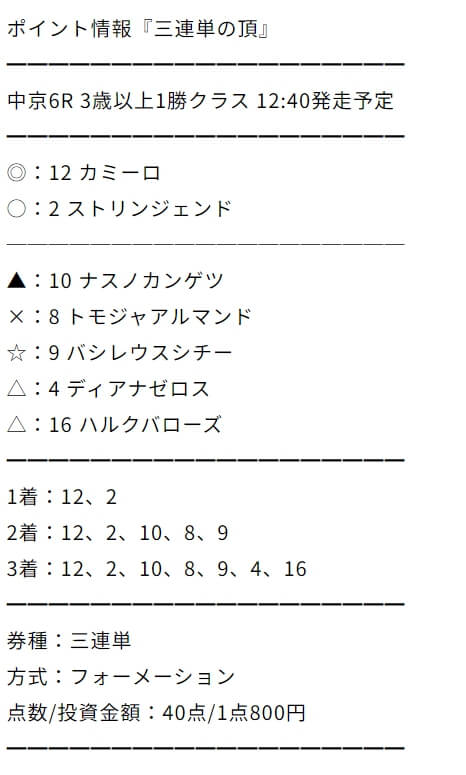 2500円を12点と買い目も抑えめでしたがしっかり当てて貰えて信頼度厚いです。