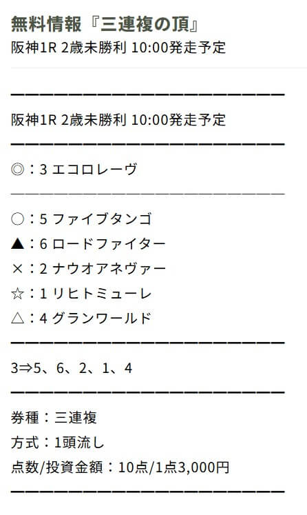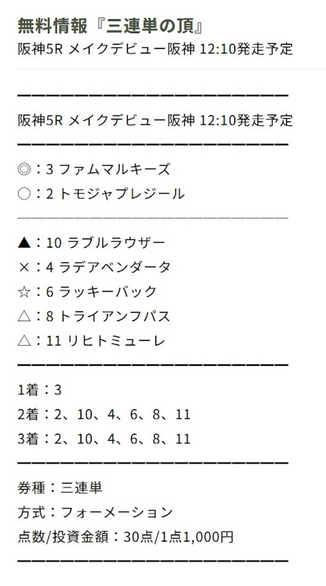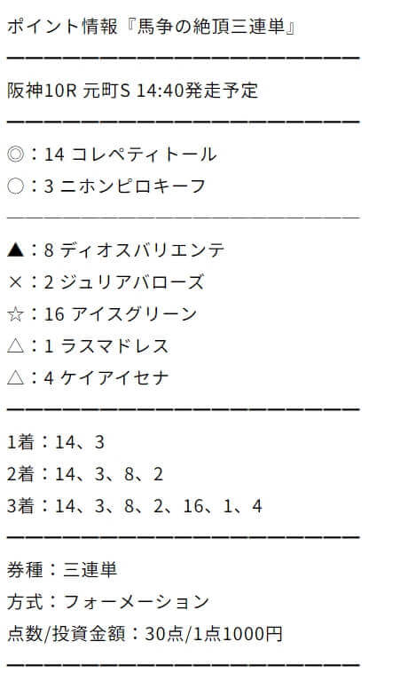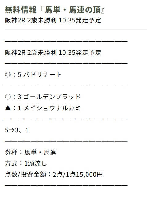 阪神2レース、結果を見れば分かると思うのですが大荒れだった中的中しました。改めて馬争の頂、ただもんじゃないなと思いました。ありがとうございます。