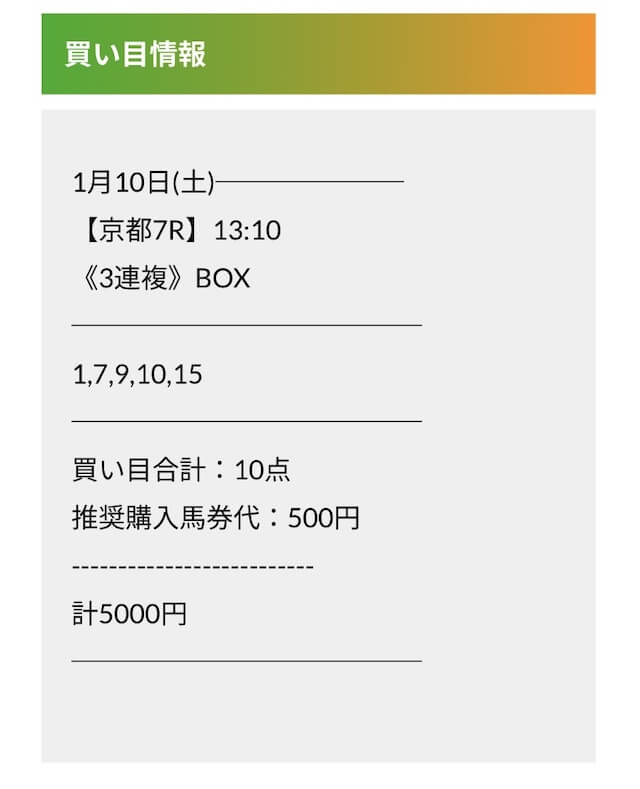 予想の券種は3連複で買い方は5頭ボックス。