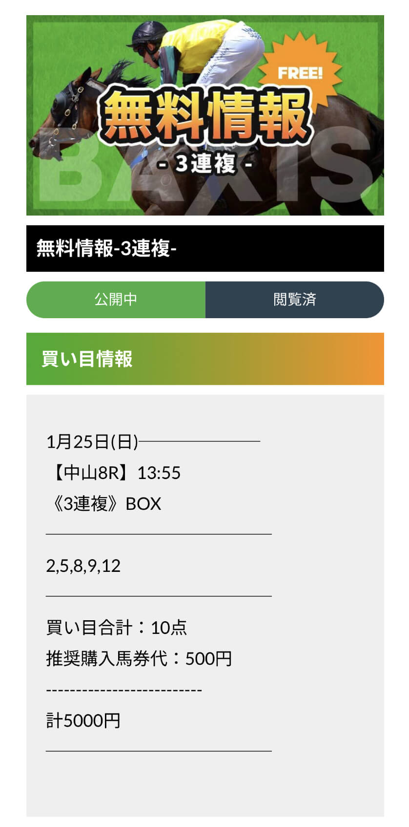 バクシスの無料予想は3連複なのに万馬券も余裕で狙える。