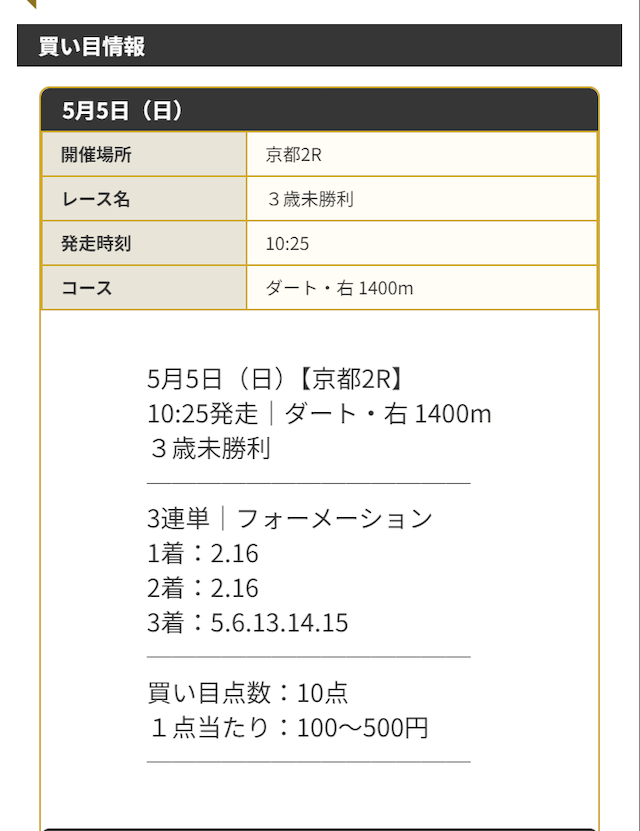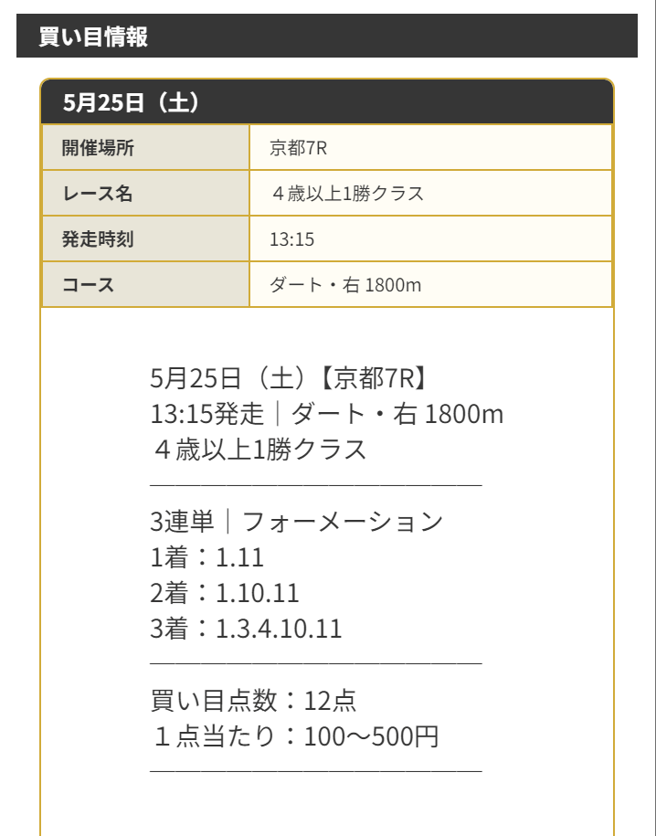 | 2024/05/11 | 京都8R [📷] | ⭕️ | 213,400円 |