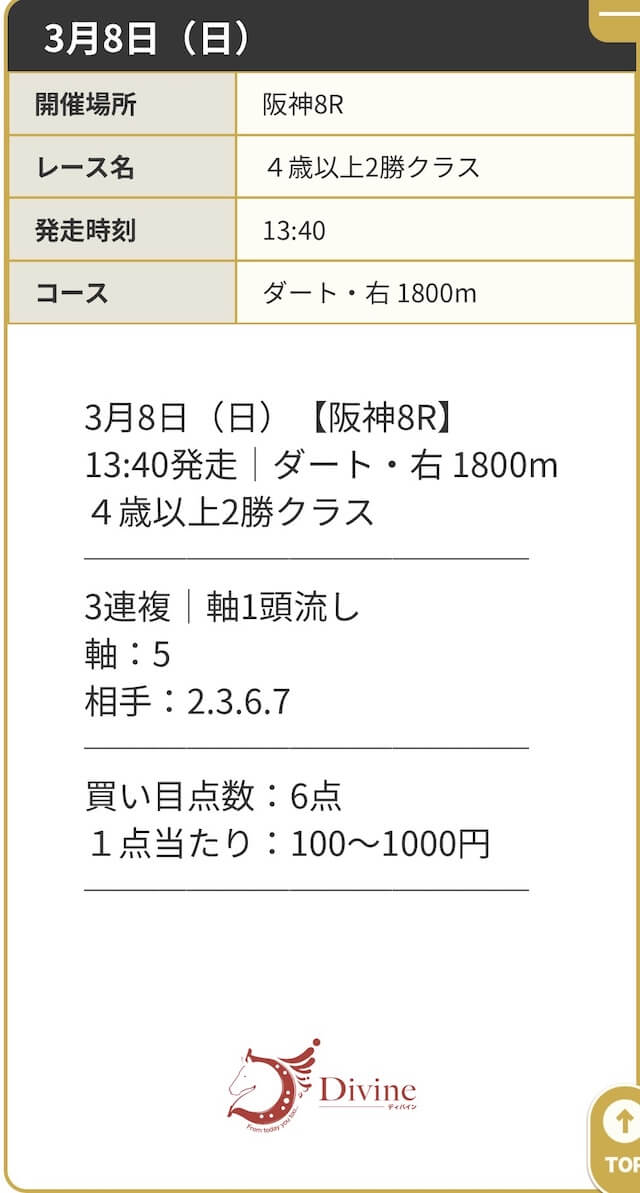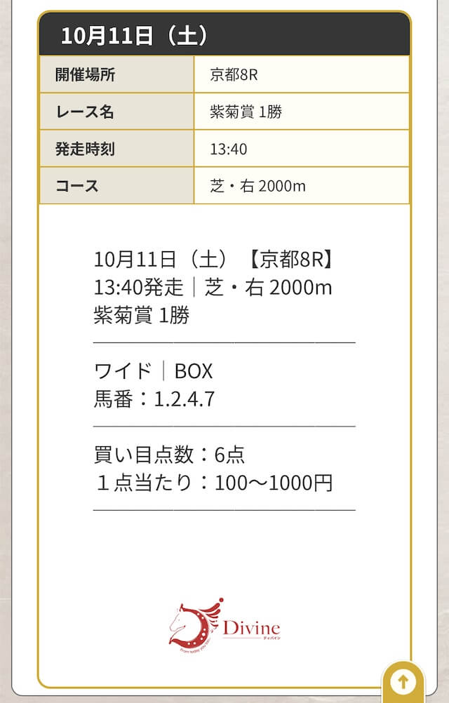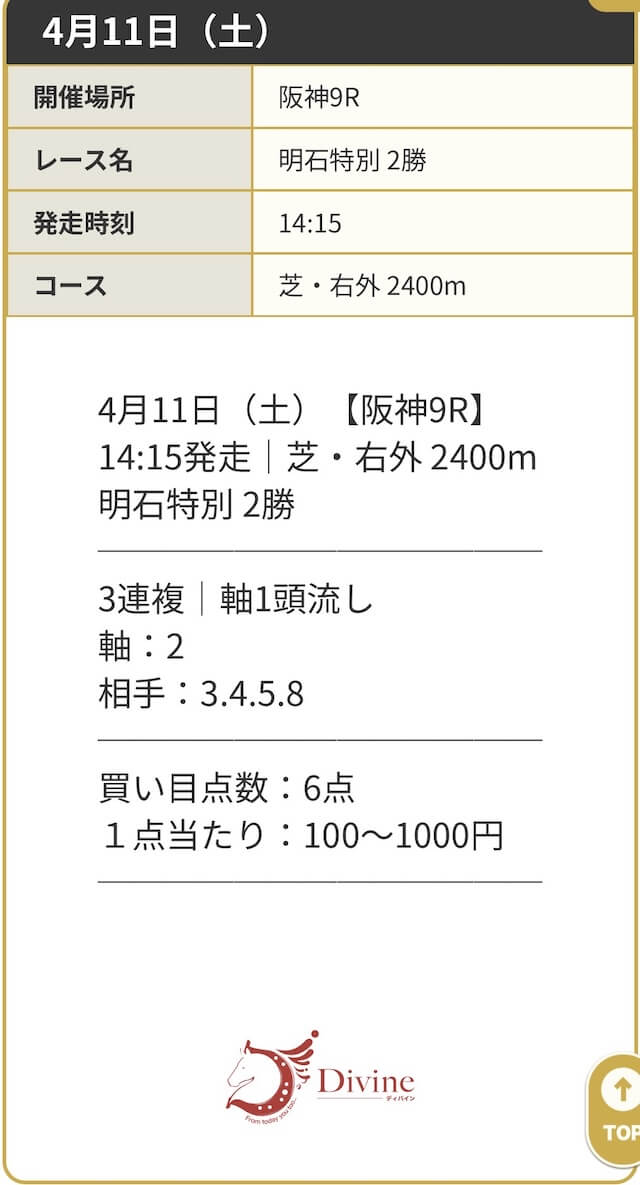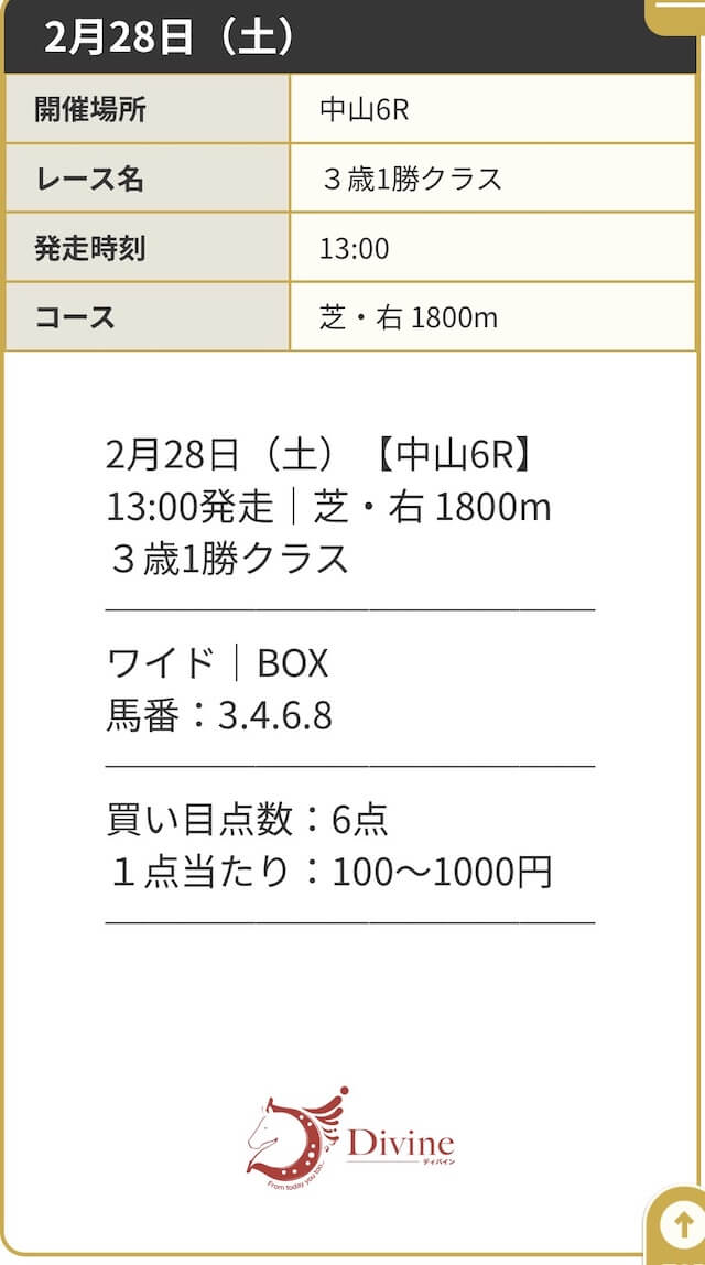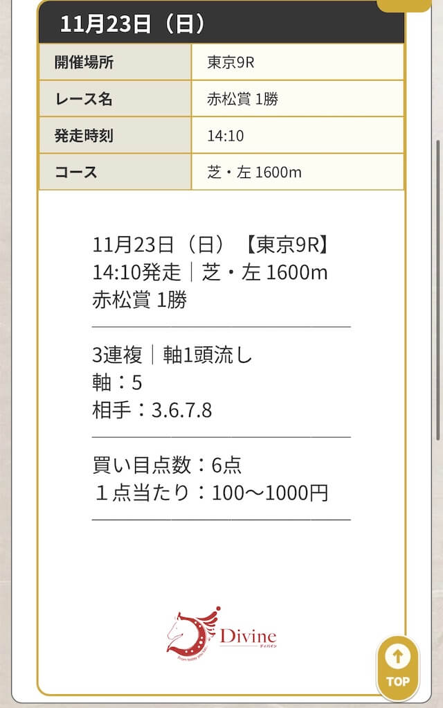 引き続き無料予想で勝負し、ディバインの実力を確かめていきます。