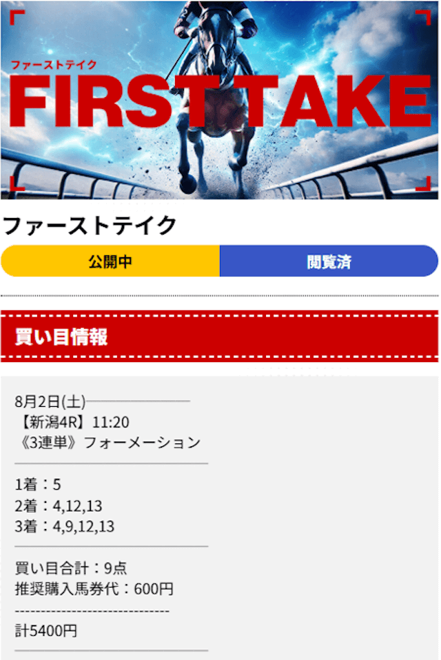 | 8月2日 | 新潟4R | 3連単 | 5,400円(1点600円) | 604.1倍 | 362,460円 |