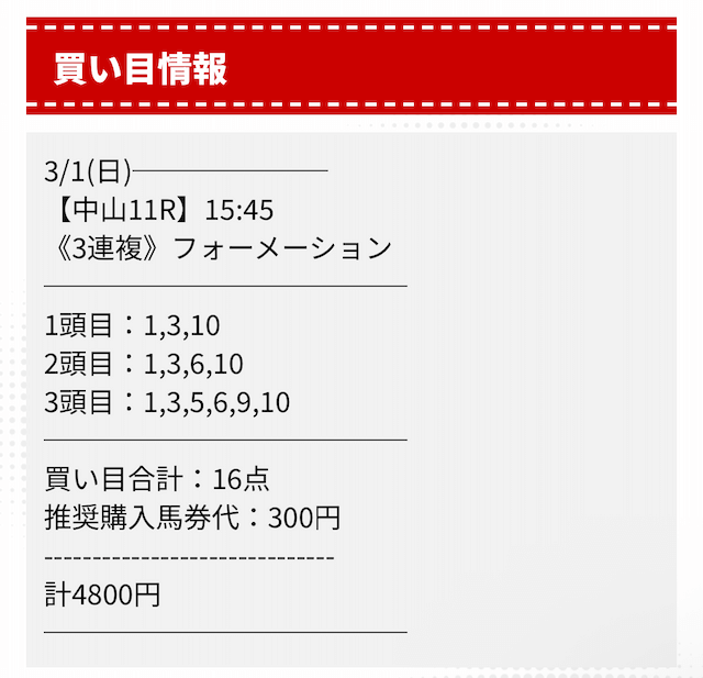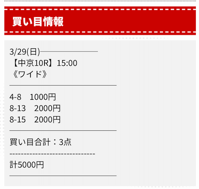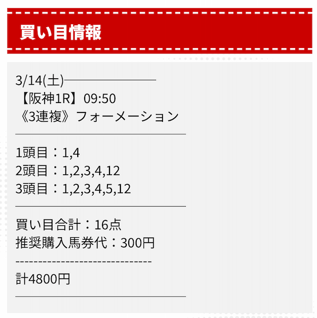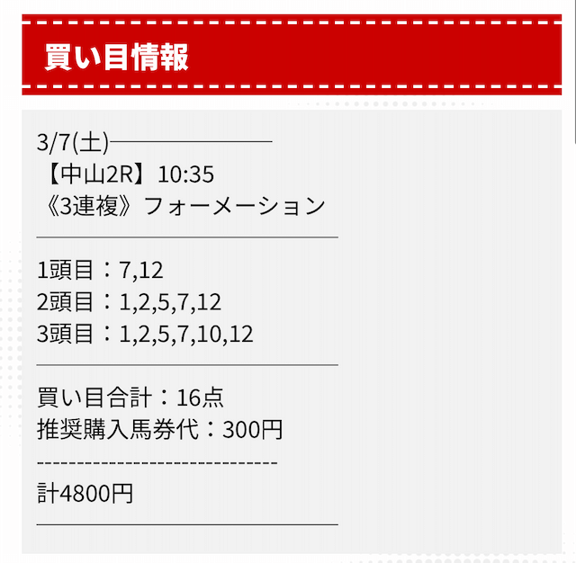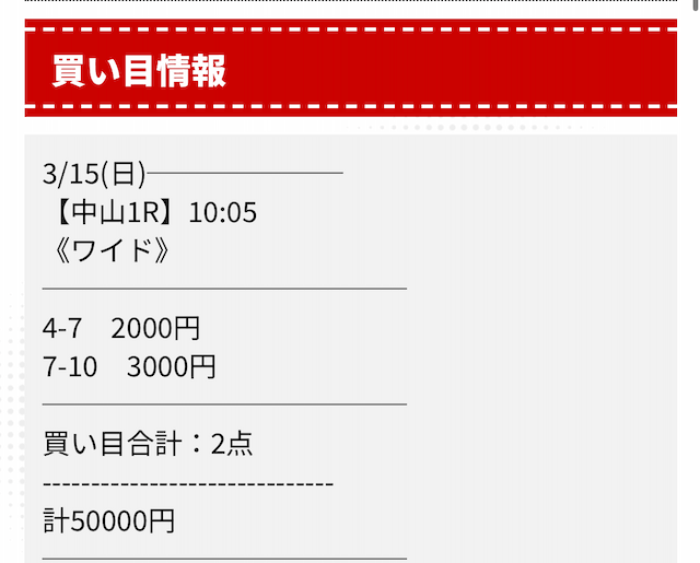払戻だけではなく、参加レース・券種・点数・推奨金額の全てが一致していたので、捏造の可能性は低いでしょう。[/吹き出し-ライター選択]