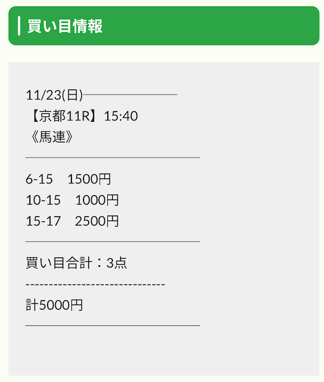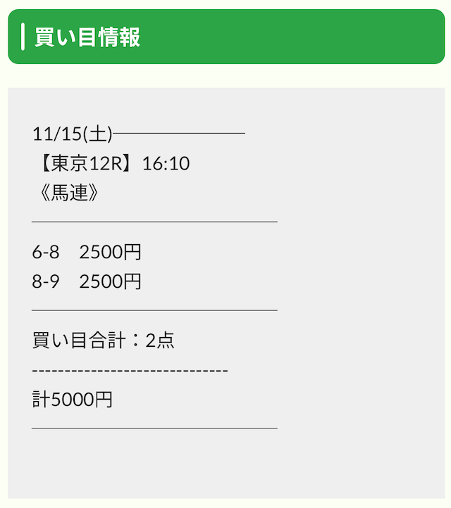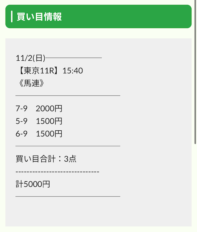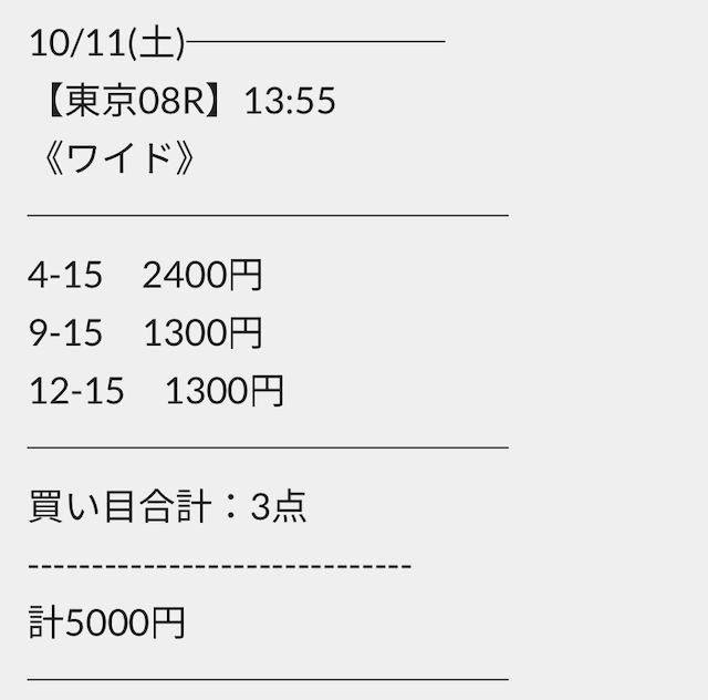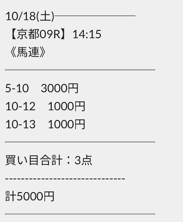 馬券代は、買い目毎に異なっており、計5,000円で勝負していきます。