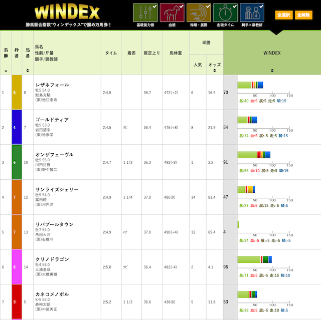 WINDEXは過去データから予測する基礎能力値や、母父の血統など、馬の様々な要素を数値化したもの。