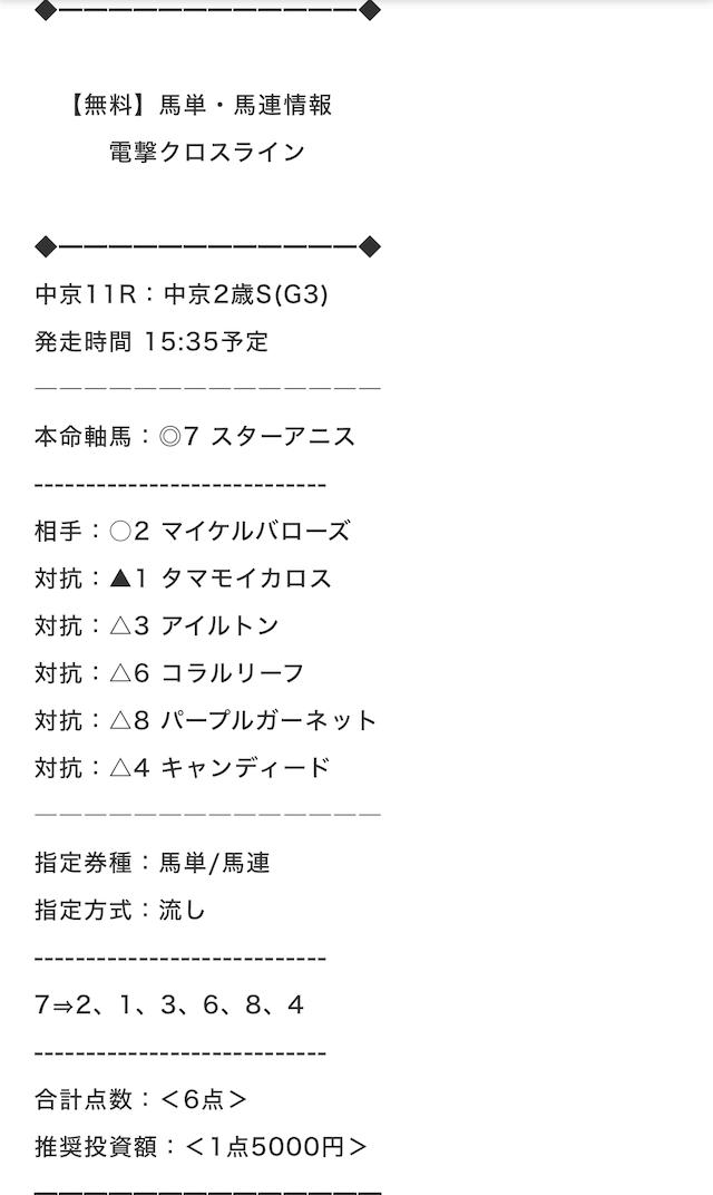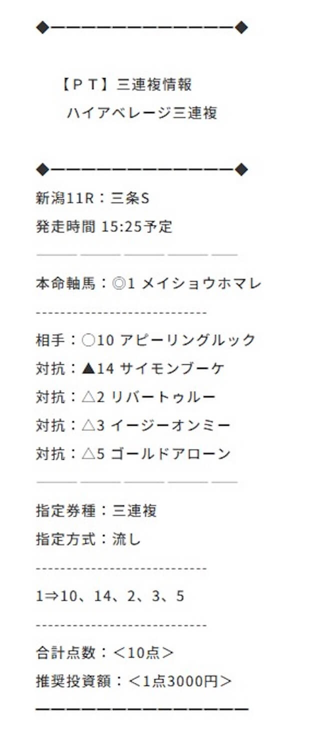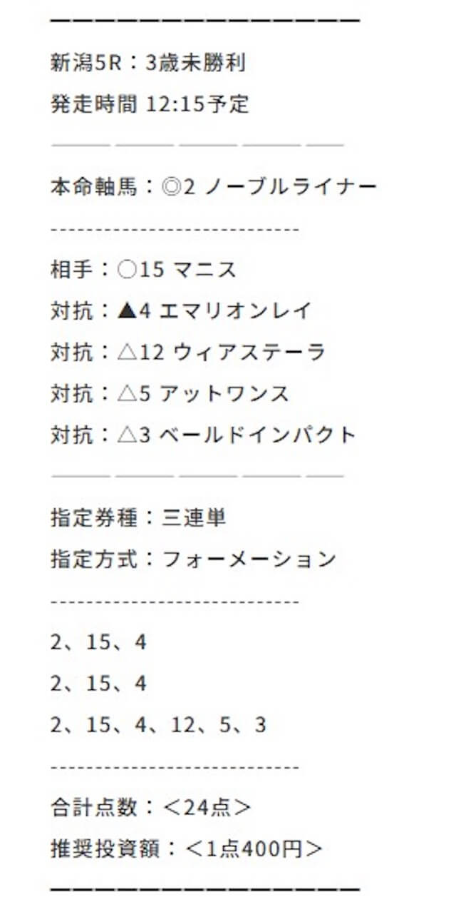 三連単で賭けたら見事に的中させて10万以上儲けさせてもらったわw穴馬の選定も完璧で超信頼できる