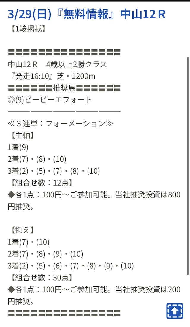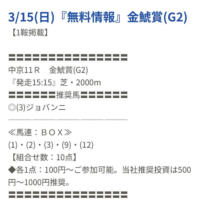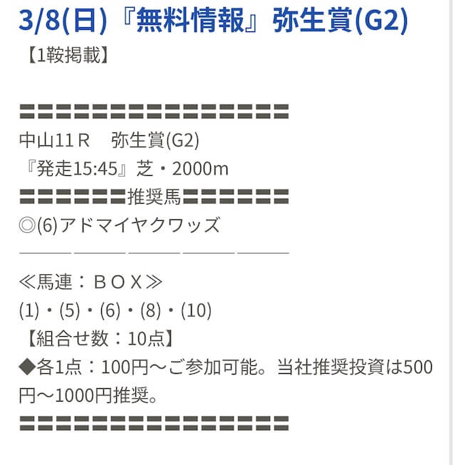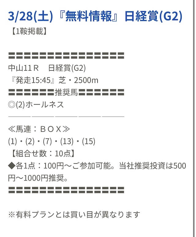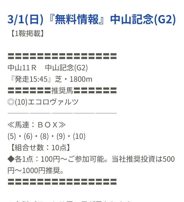 先週初めて無料予想を受け取り、中山10Rの予想に参加したのですが残念ながら不的中でした。