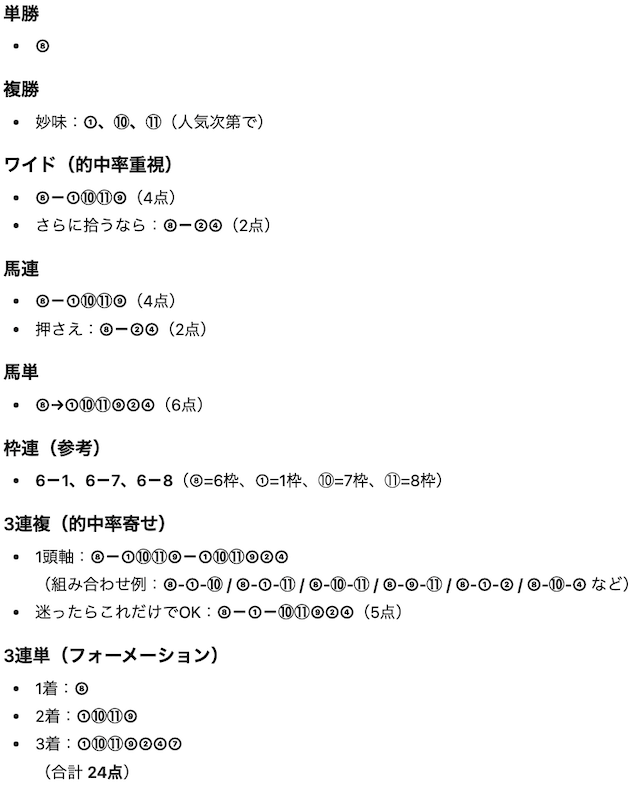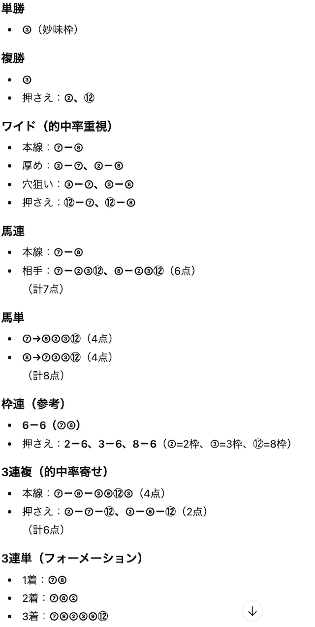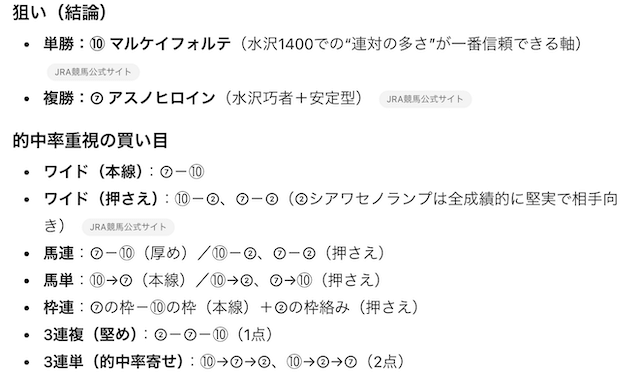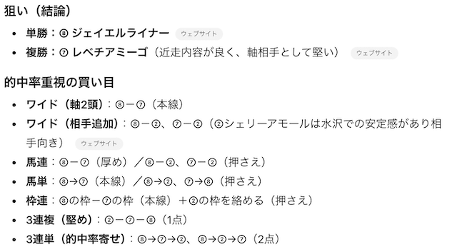 この点を考慮して、Chat GPTが予想印を出してくれました。
