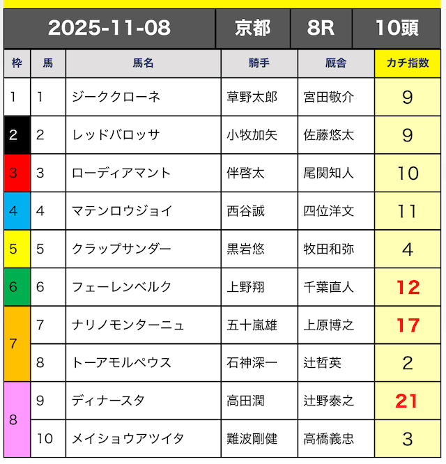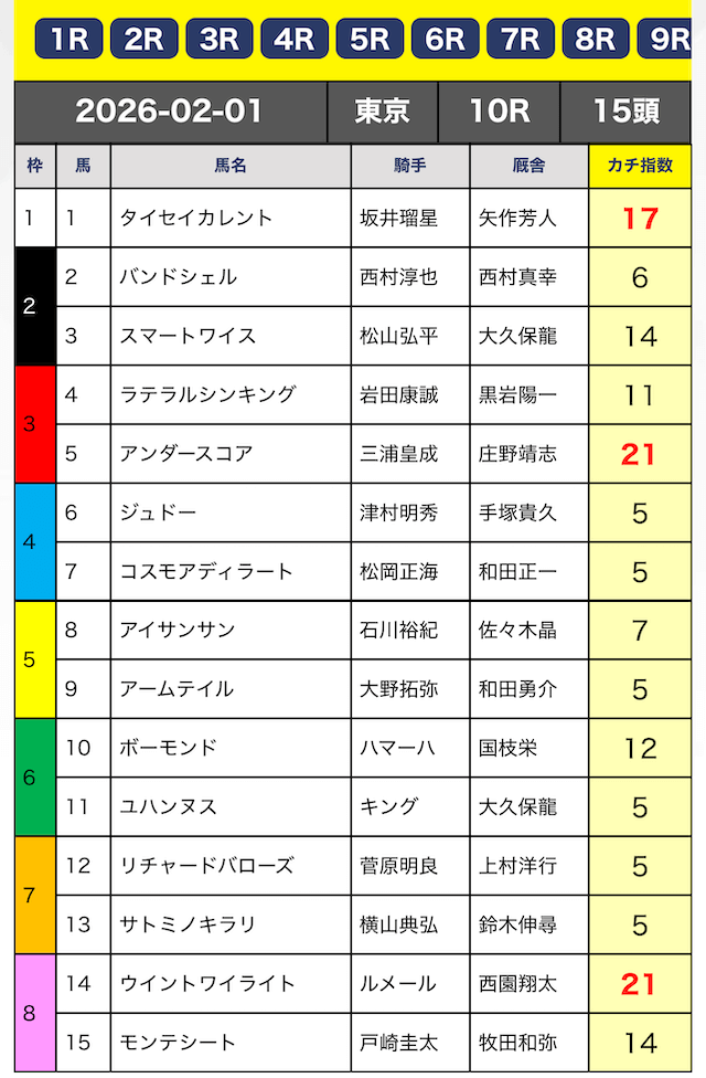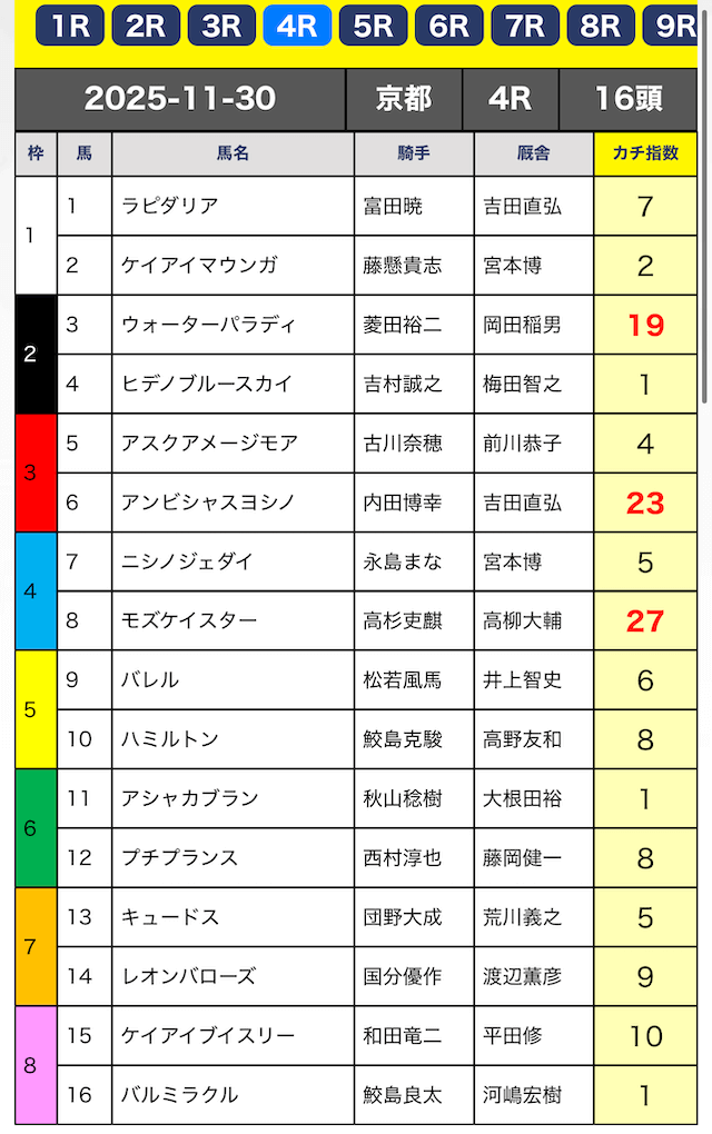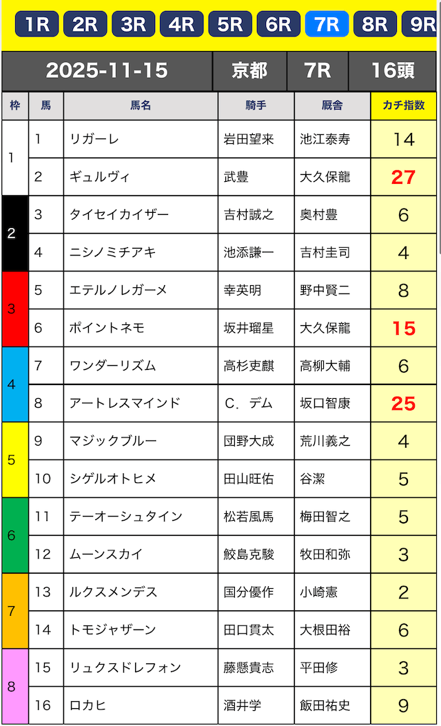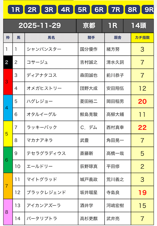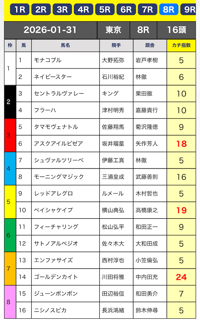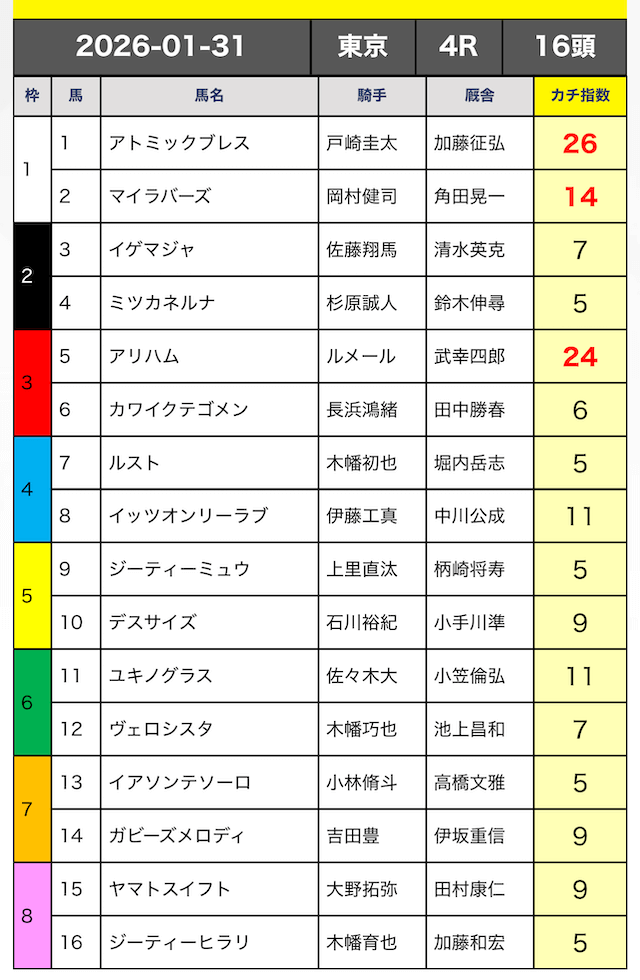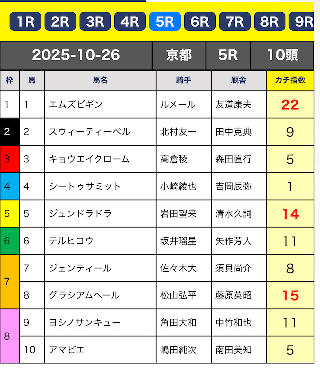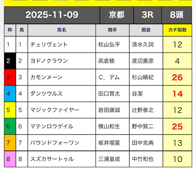 無料予想が公開されたらまず、一番右の『カチ指数』を見ましょう。