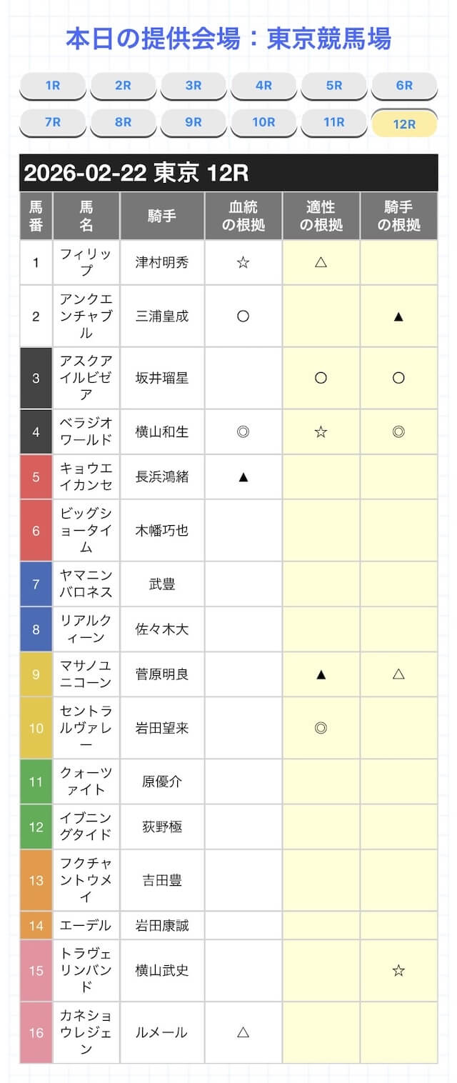 13番人気の⑫グレノークスは適正の根拠に◎の印がついていますが、過去成績を見る限りでは、全く適正があるとは思えません。