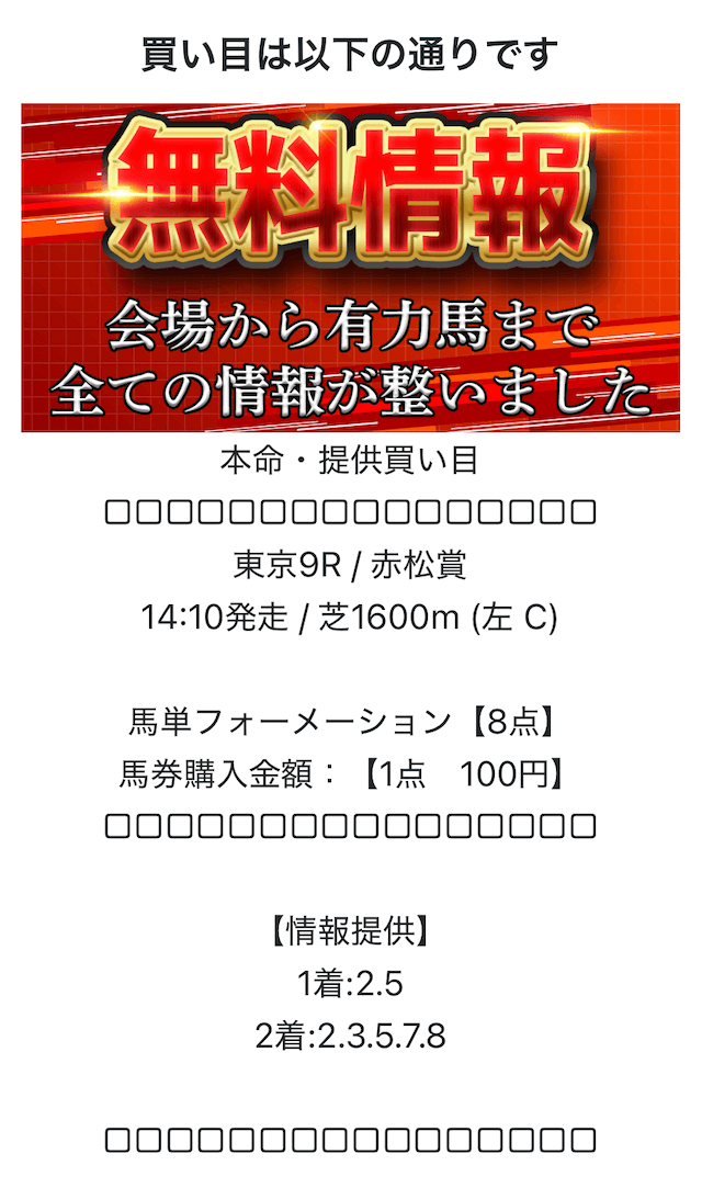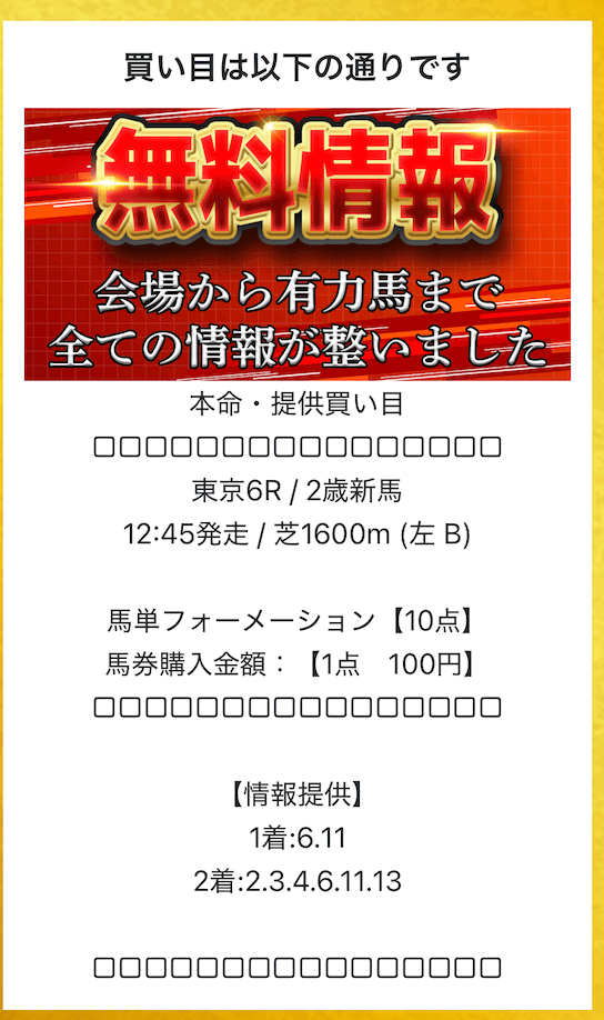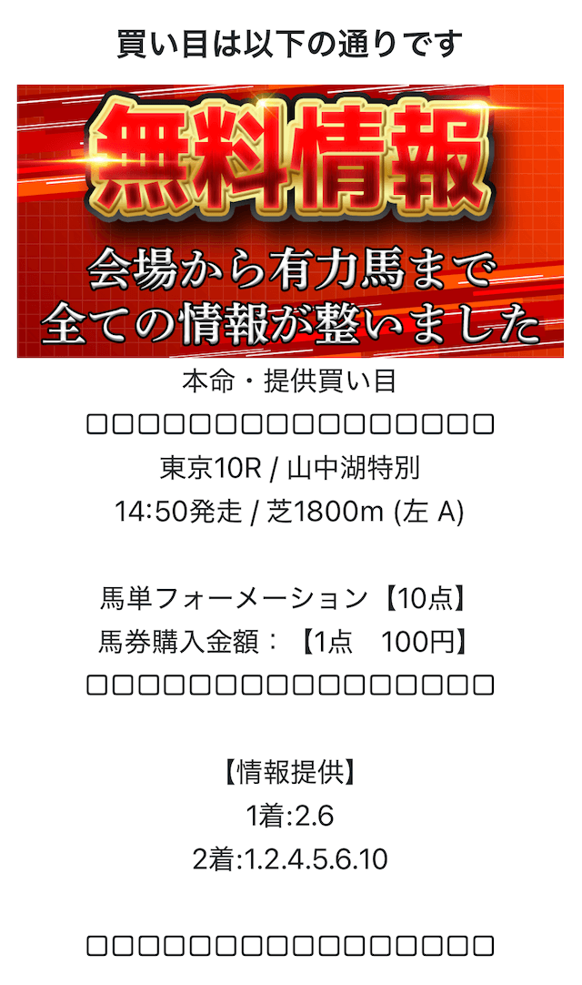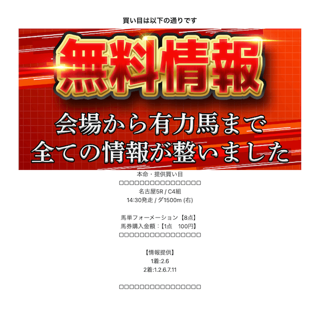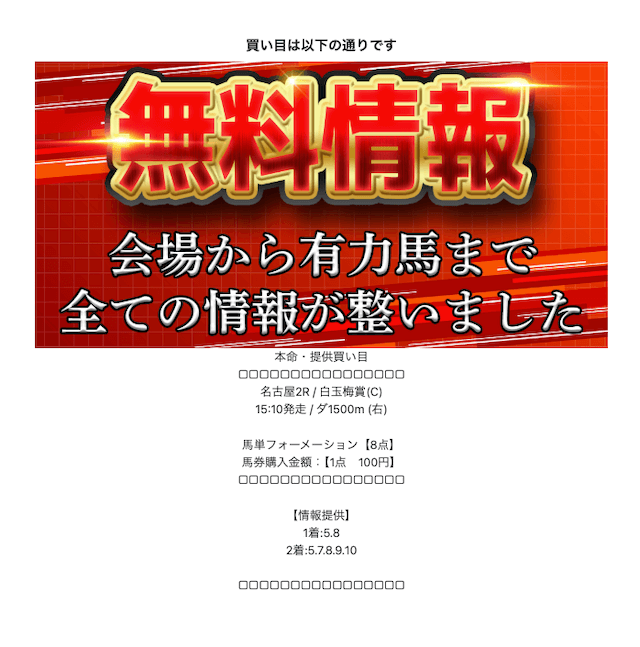 現在、競馬戦線に投稿された本命の口コミが以下の通り。