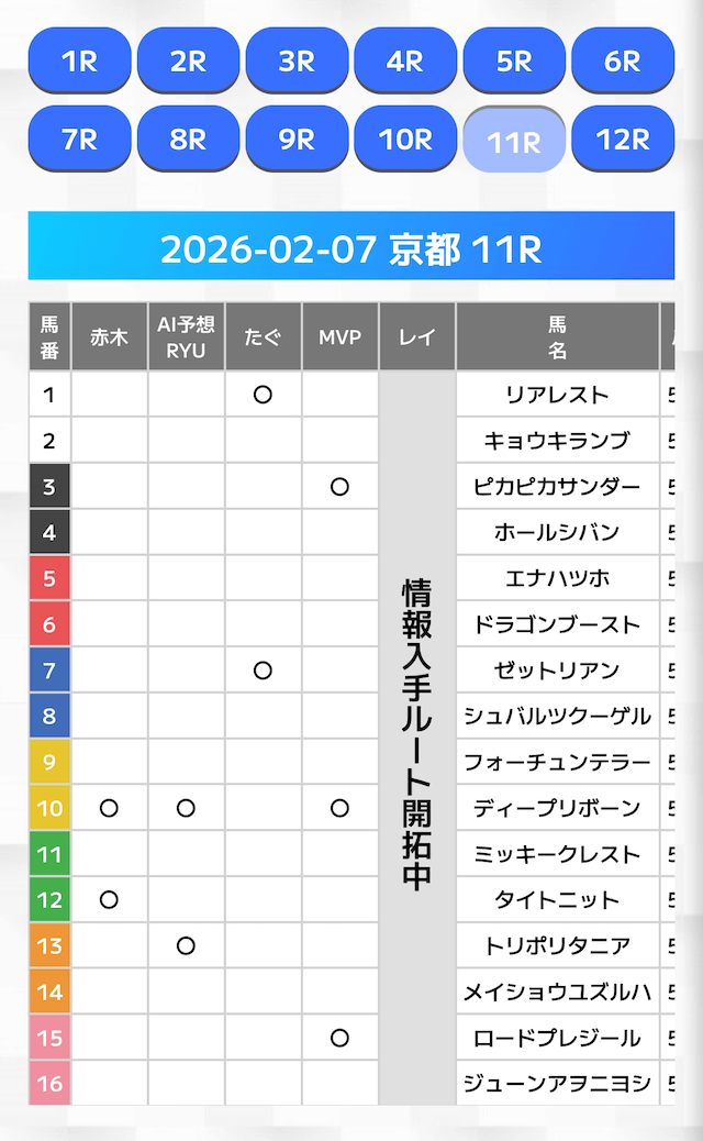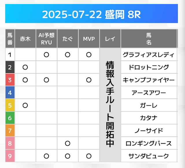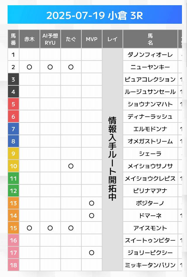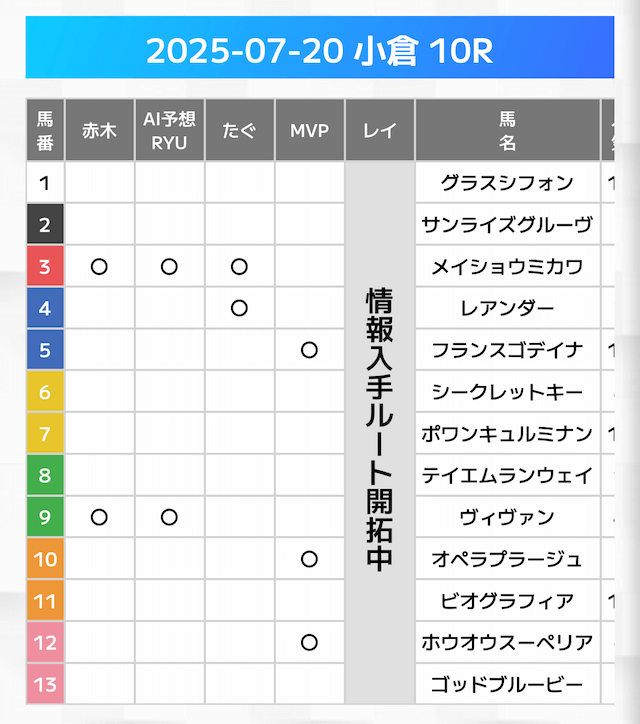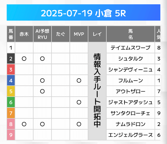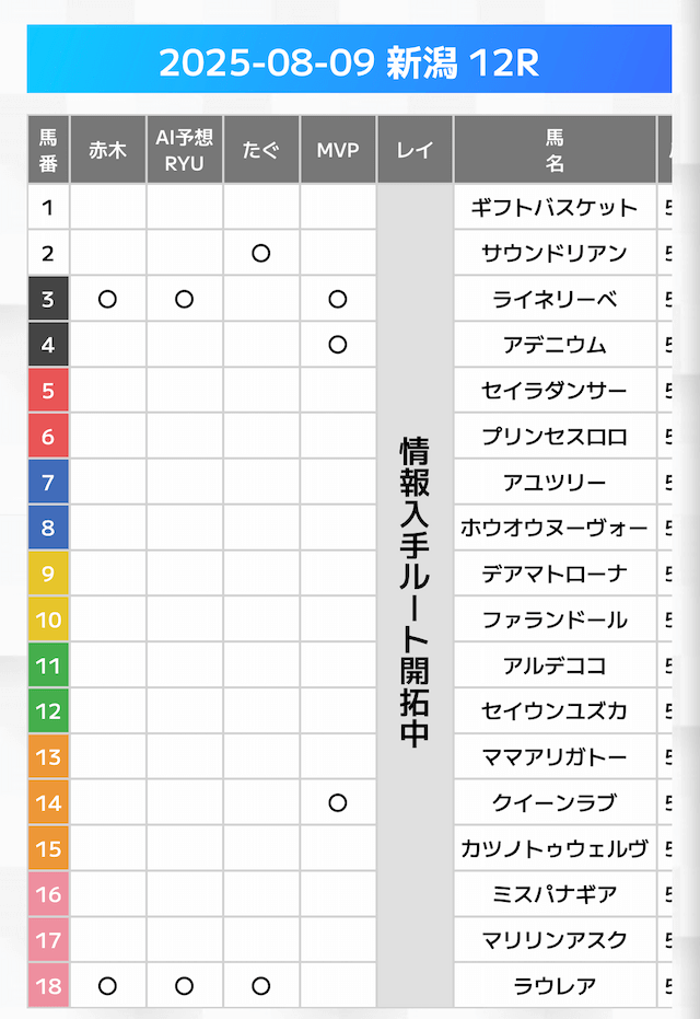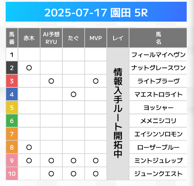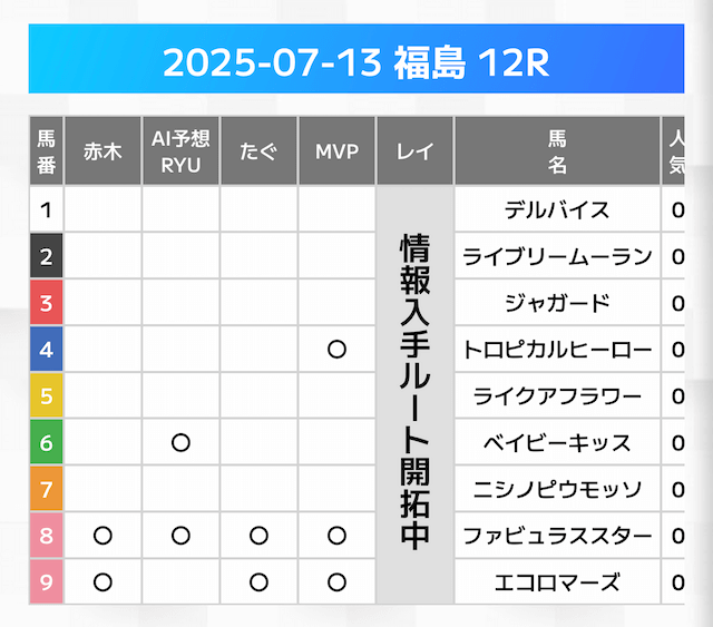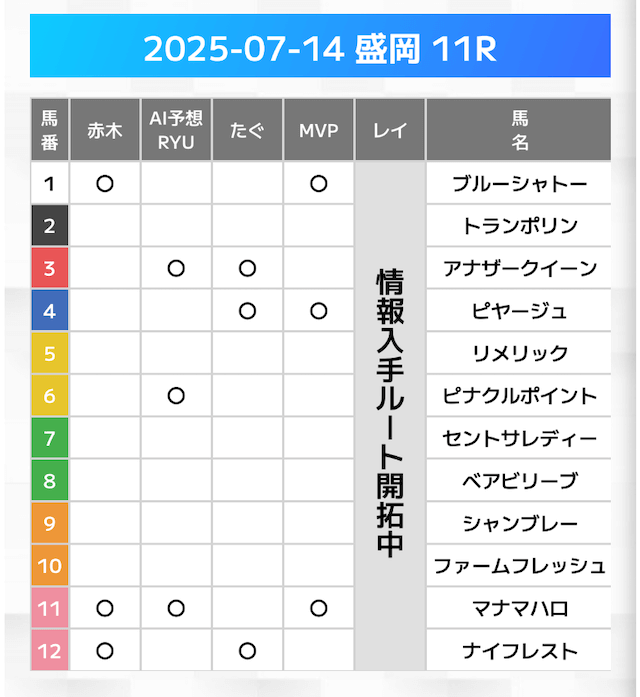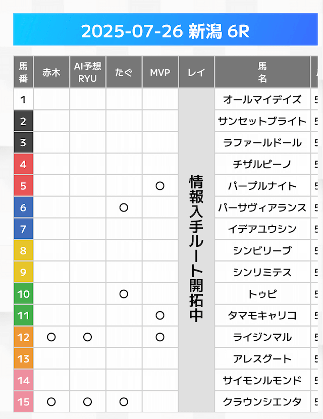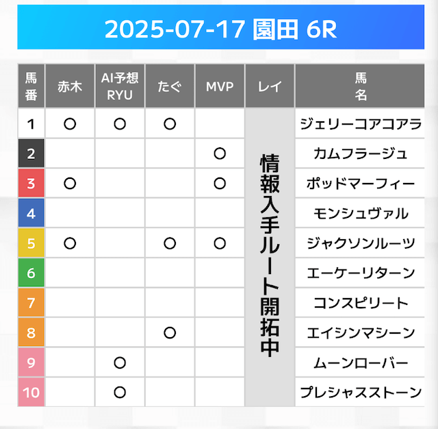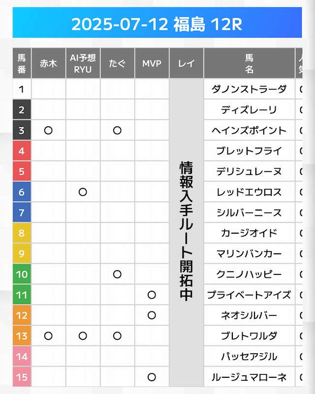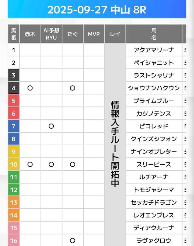 有力馬には「◯」の印が打たれており、複数人の有力馬予想を見ることが可能です。