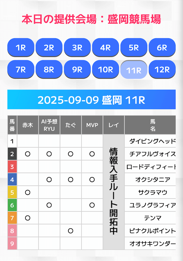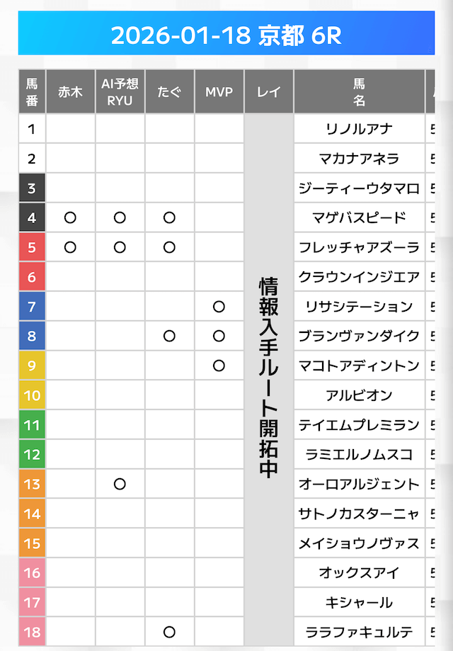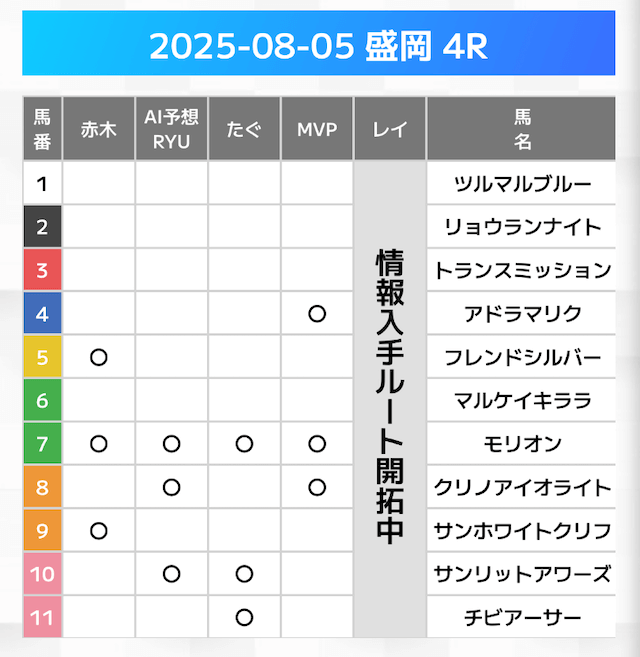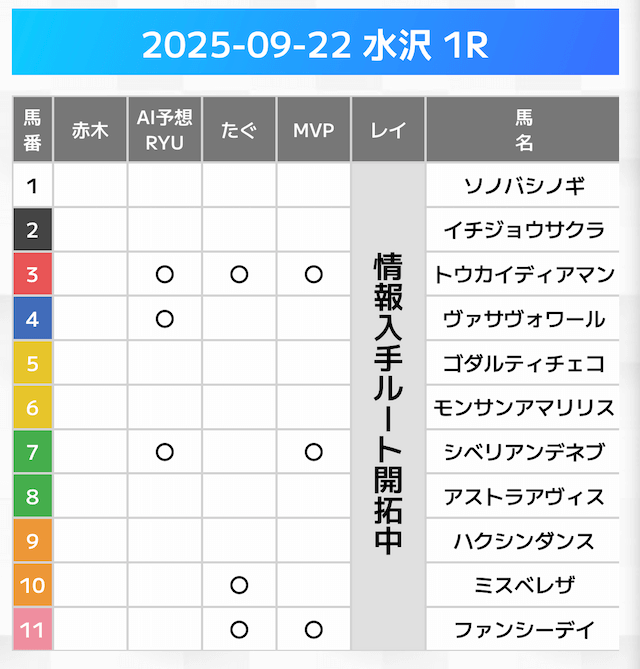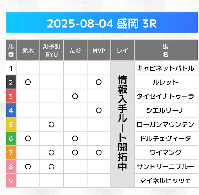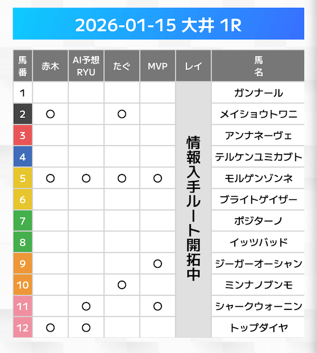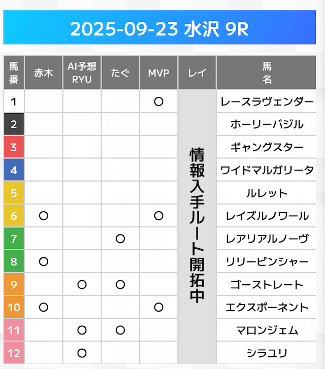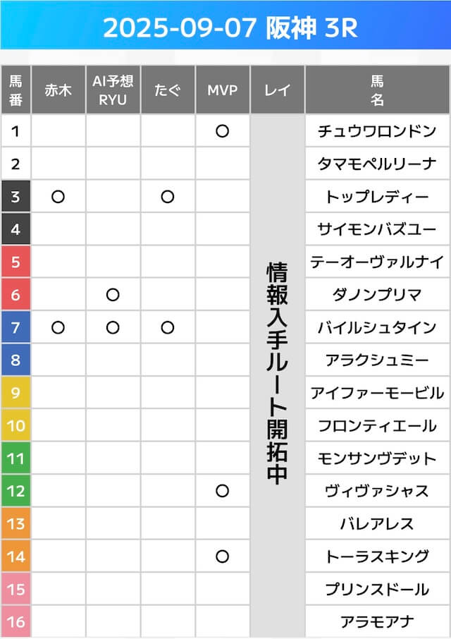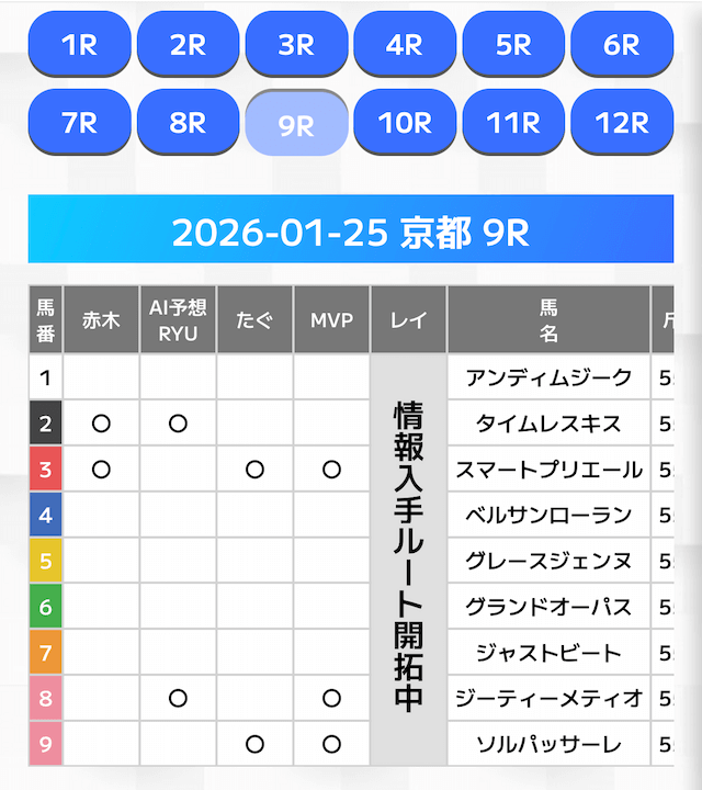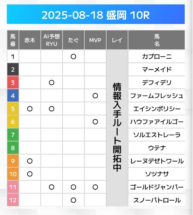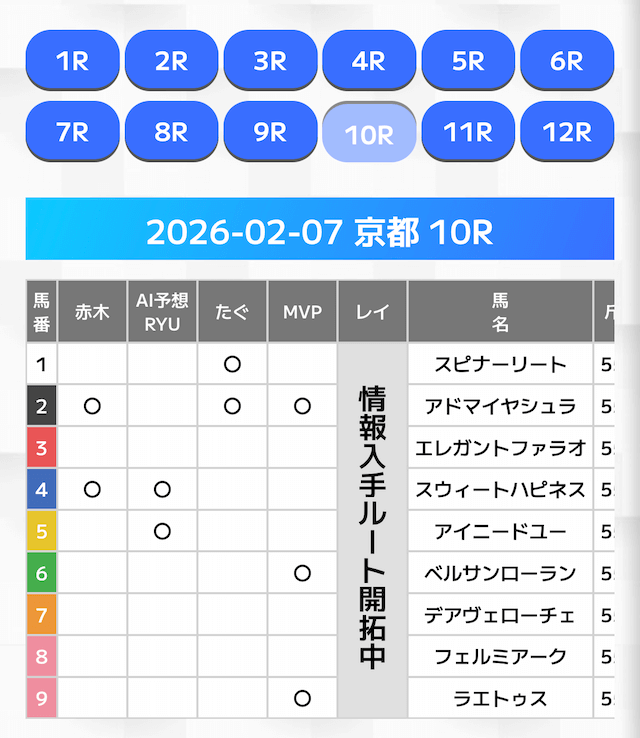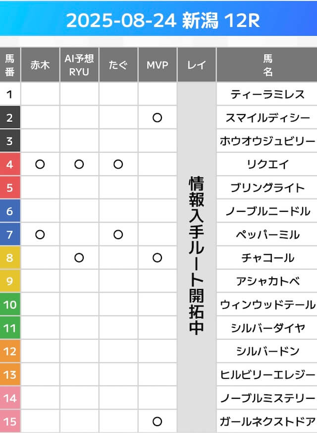有力馬には「◯」の印が打たれており、複数人の有力馬予想を見ることが可能です。