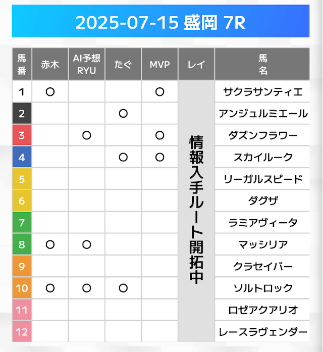 万馬券エキスポの予想は複数の予想家が有力馬に印を付けるスタイル。