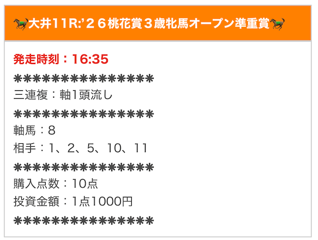 真偽は不明ですが、推奨通り1点2,000円の合計10,000円で馬券を購入します。
