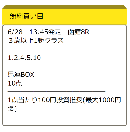 馬単・3連複とは思えない安定感で利益を積み重ねています。堅いレース、荒れるレースによるブレなどは一切なく、どちらも予想の精度が高い印象です。無料予想に継続して参加しようと思います〜