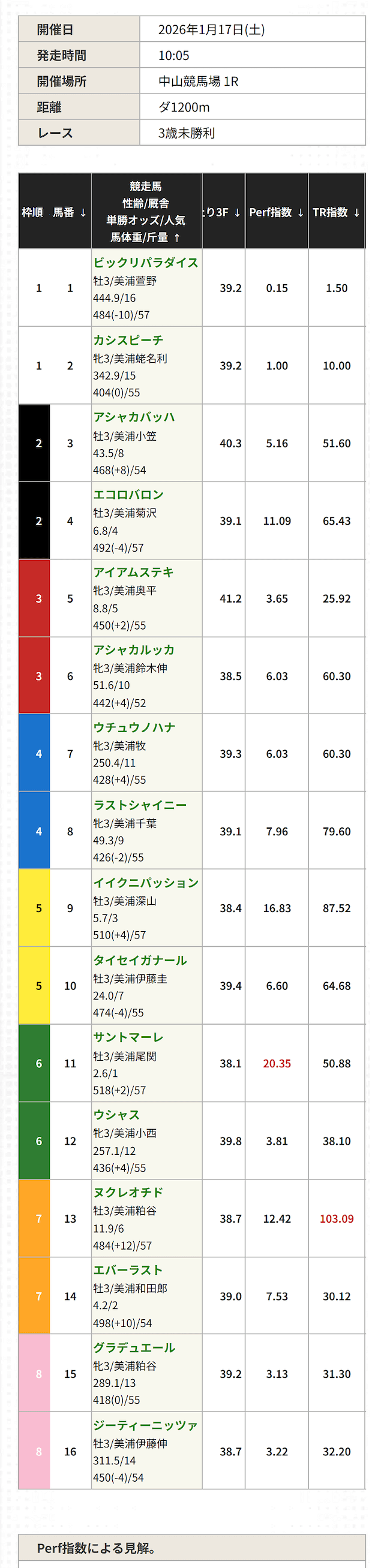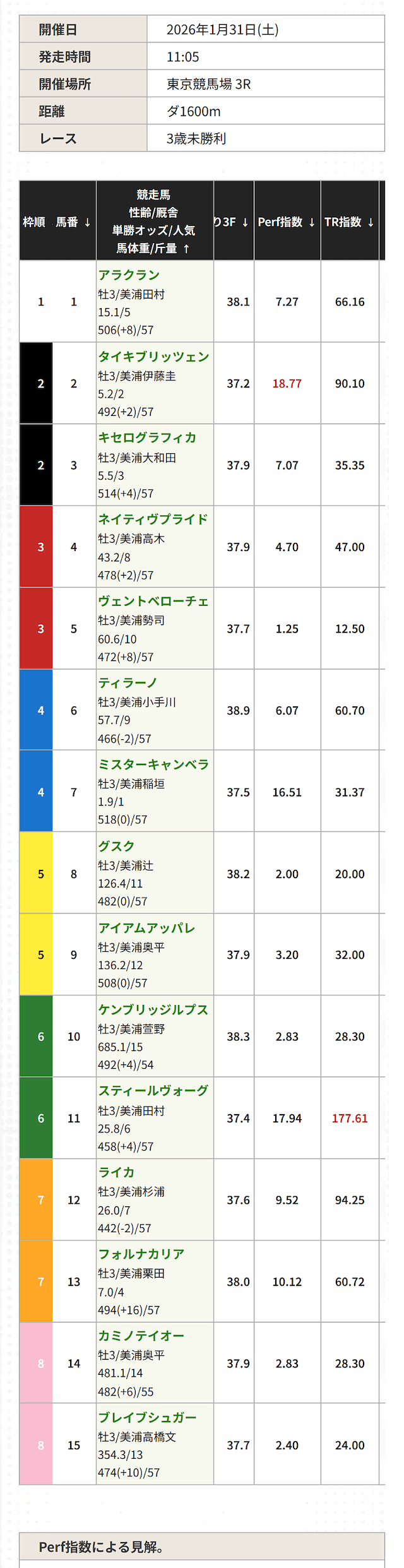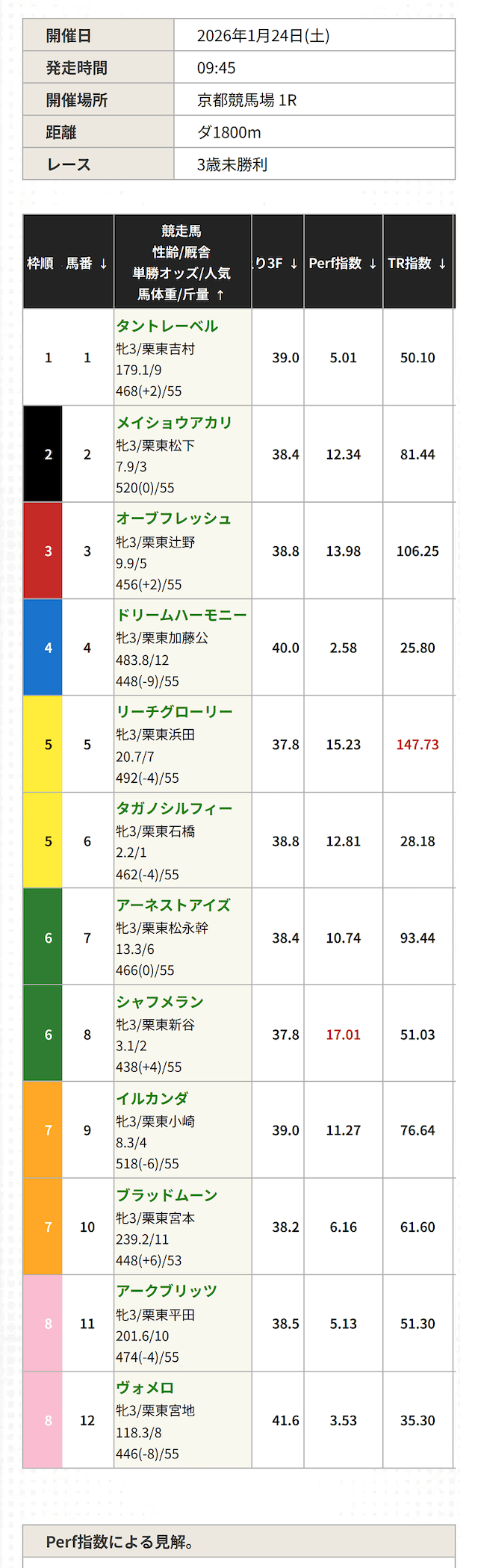 全頭のPerf指数・TR指数が公開され、最も指数が高い数値が赤く表示。