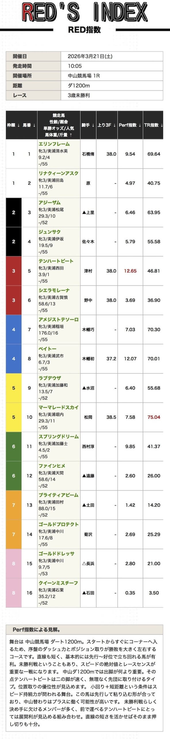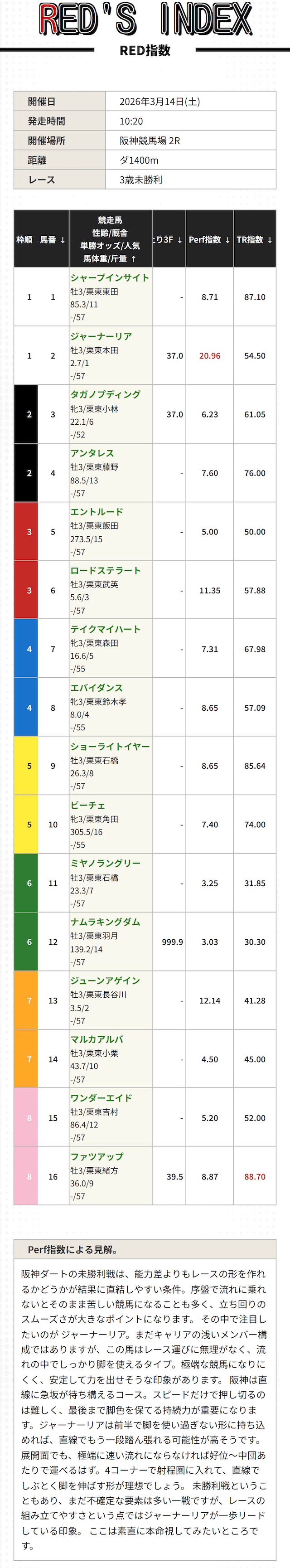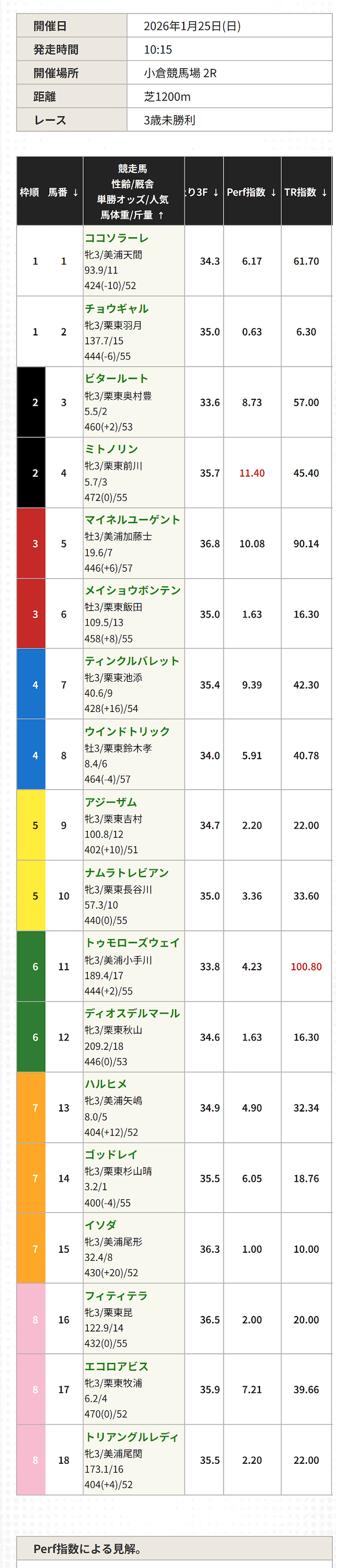 全頭のPerf指数・TR指数が公開され、最も指数が高い数値が赤く表示。