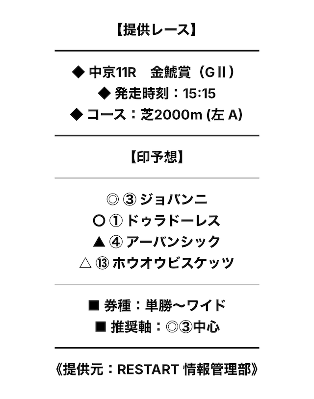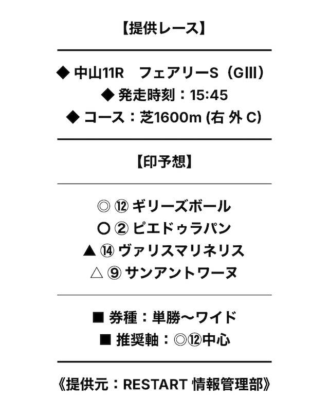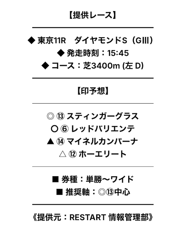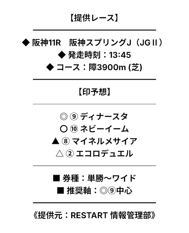リスタートの無料予想は、買い目ではなく予想印のみが公開される形式です。