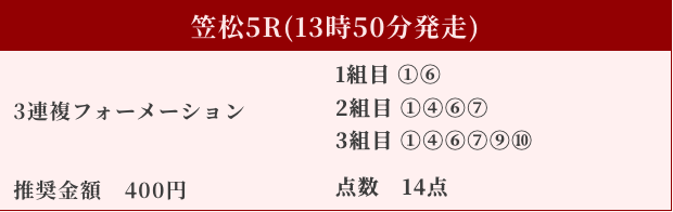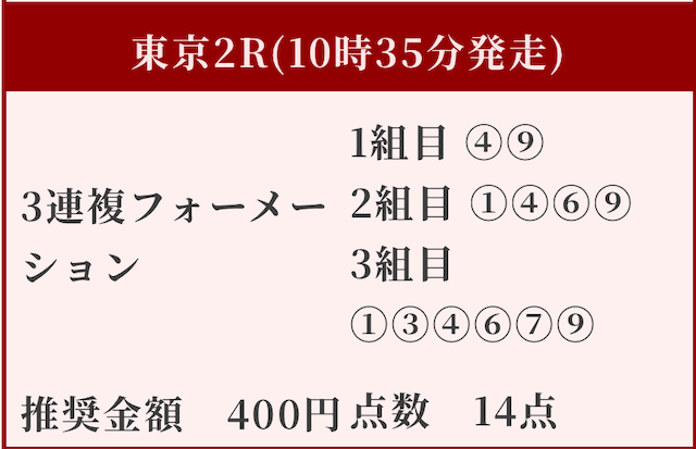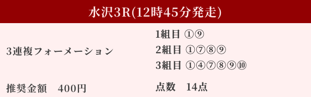 人気どころを軸に、配当妙味のある馬を相手に絡めたフォーメーション。