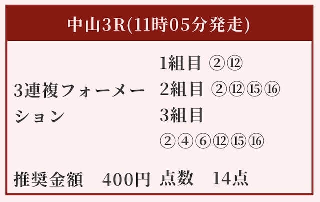 投資金額は推奨400円ですが、競馬戦線は1点1,000円の合計14,000円で勝負します。