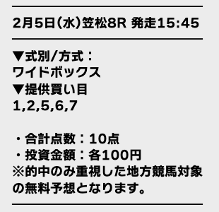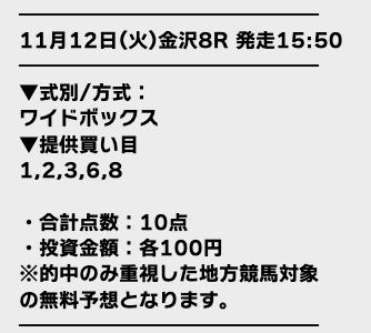 提供された買い目の通り決着!正直、他社サイトで損してた分を一気に取り返せた感じ。この調子で続けたい。