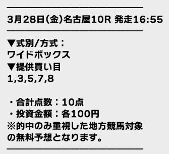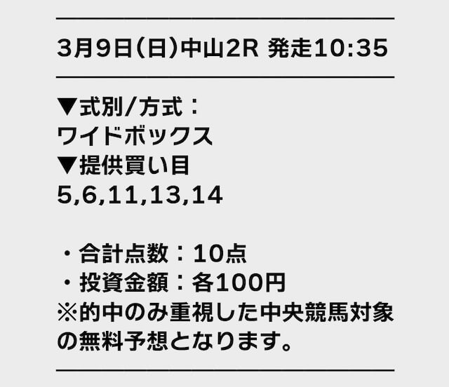 予定では、1点100円での購入していくつもりでしたが、実際に公開された予想・競馬戦線の軍資金を考慮し1点1,000円で勝負していきます。