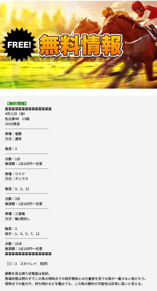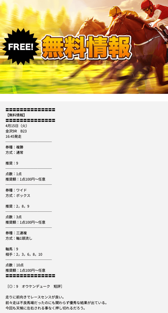 無料予想に10回勝負したときの的中率はなんと90%。