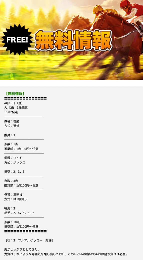 3つの予想の中から自分なりに考えて選ぶ必要があるので、競馬初心者には少し過酷かもしれません。