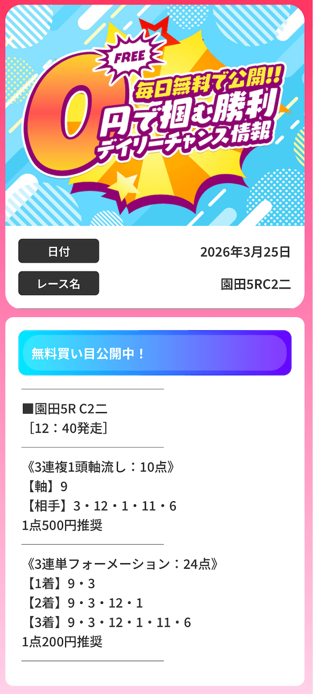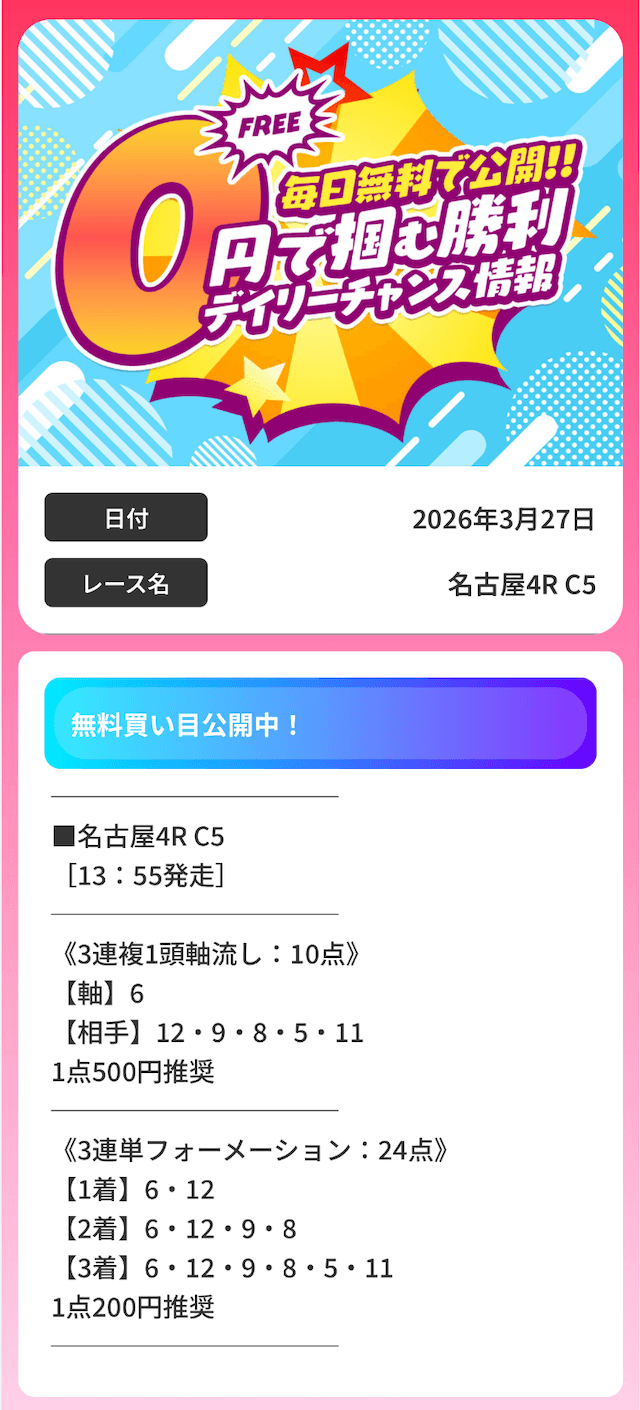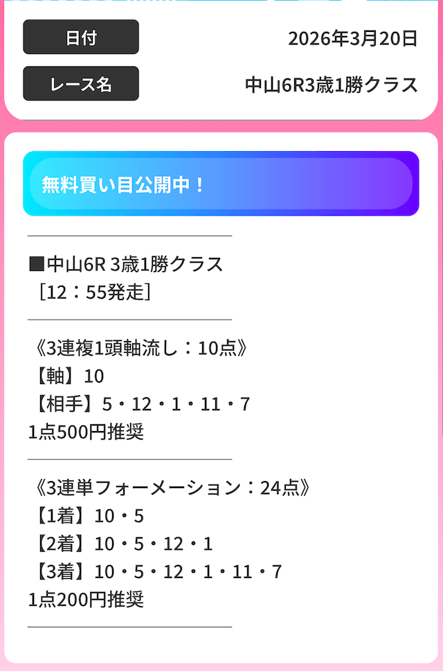 | 推奨投資金額 | 1点200円(三連複3,000円/三連単6,000円) |