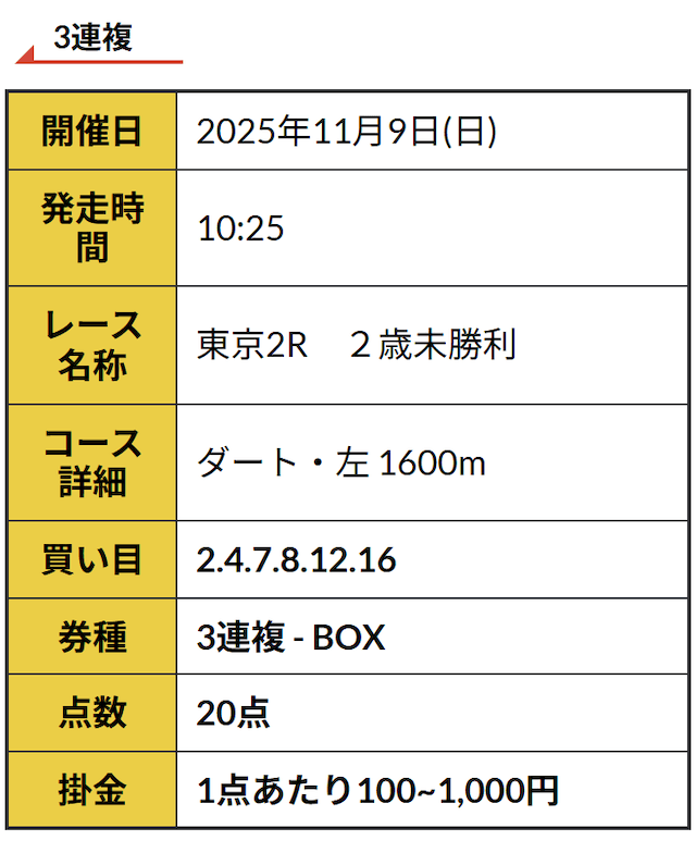 | 券種 | 的中率 | 回収率 | 払戻金 | 利益 | 2025/10/4 東京7R[📷] | 2025/9/14 阪神10R[📷] | 2025/9/6 中山4R[📷] | 2025/8/31 新潟12R[📷] | 2025/8/30 新潟2R[📷] | 2025/8/24 札幌6R[📷] | 2025/8/23 中京6R[📷] | 2025/8/17 札幌12R[📷] | 2025/8/16 札幌6R[📷] | 2025/8/10 新潟4R[📷] | 2025/8/9 新潟5R[📷] | 2025/7/27 中京5R[📷] | 2025/7/26 新潟4R[📷] | 2025/7/20 小倉4R[📷] | 2025/7/19 函館6R[📷] | 2025/7/13 函館10R[📷] | 2025/7/5 福島11R[📷] | |||||||||||||||||