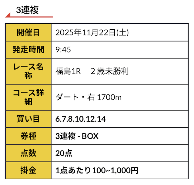 ワイド・馬連・三連複の3つの買い目の中から自分にあった券種で勝負が可能です。