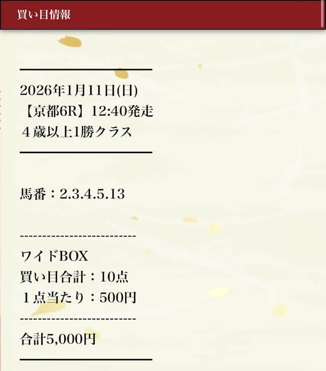 投資金額は1点500円の計12点で勝負していきます。