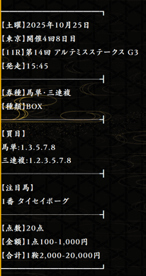 重賞レースよく当ててくれてお世話になっってます。G1参加するなら絶対見といたほうが良いですよ。