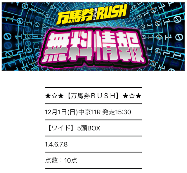 万馬券ラッシュの無料情報は、ワイドのBOXで買い目が公開されます。