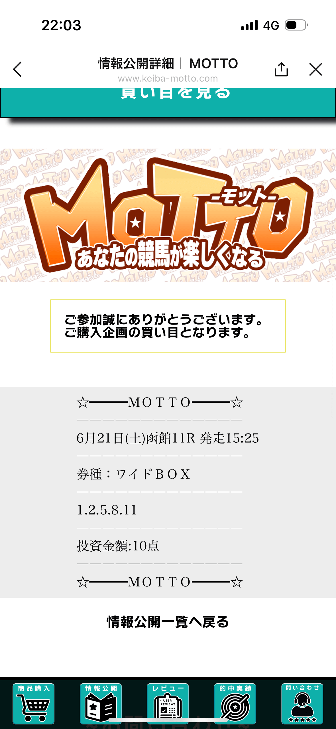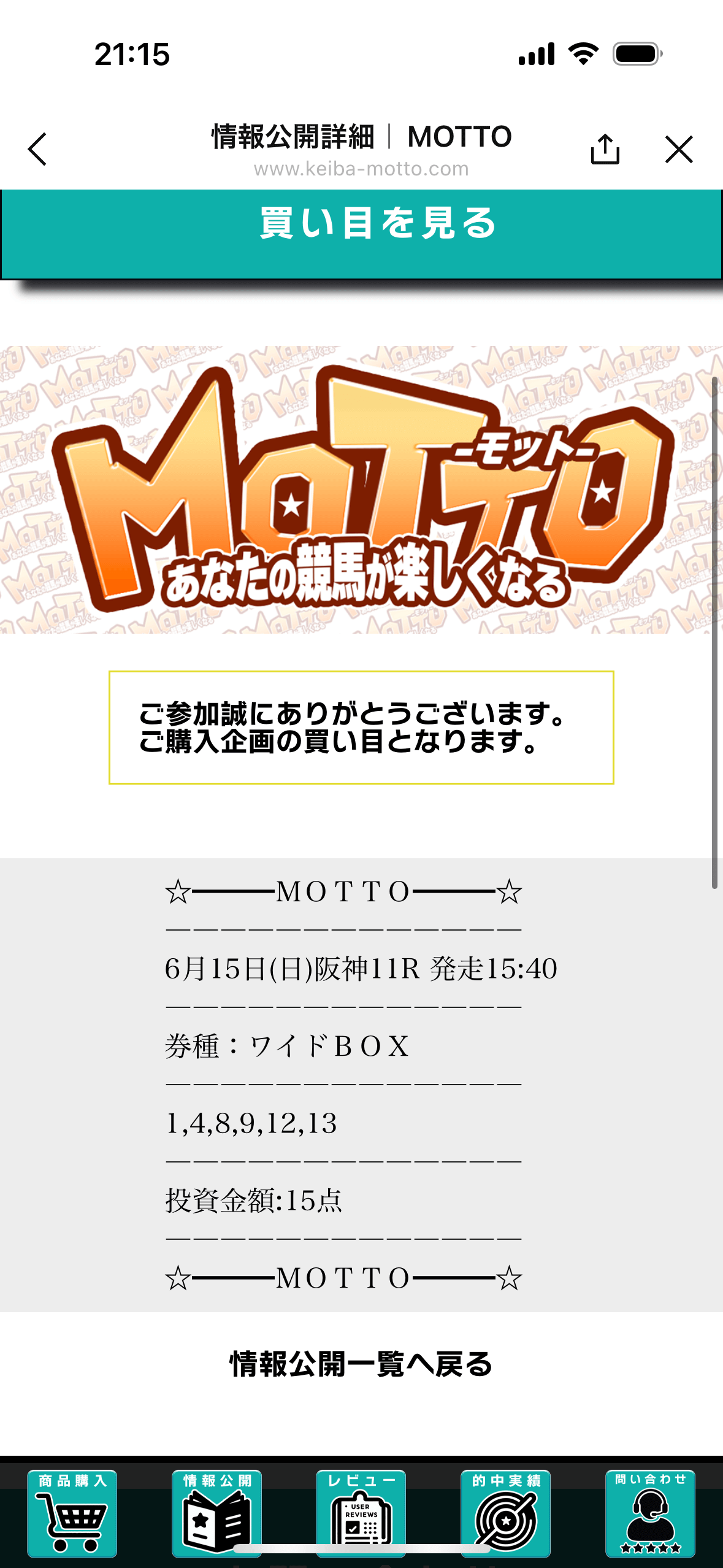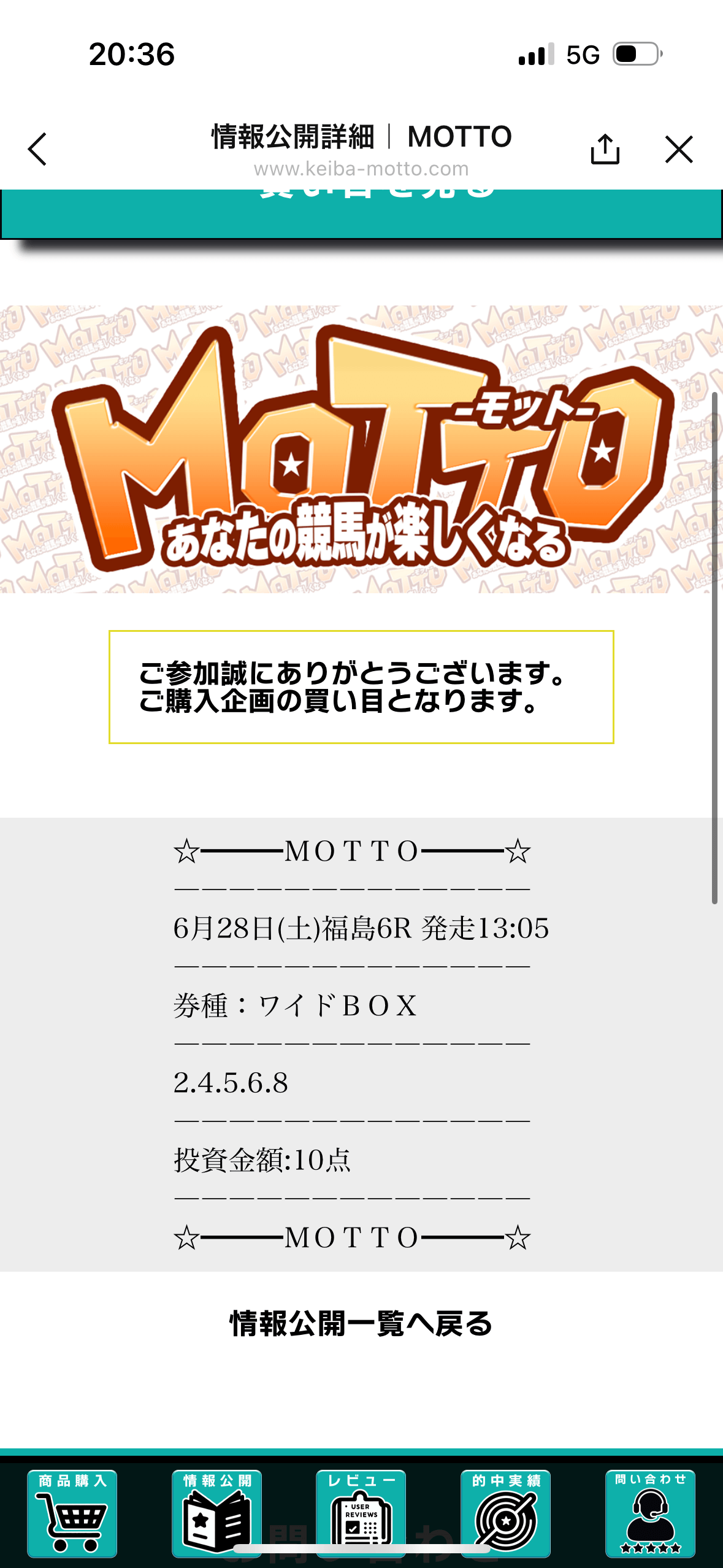驚くほど簡単に結果が出ました。最近は地方メインのサイトが増える中、中央競馬に軸足をしっかり置いて信頼できる情報くれる会社が減ったなと思ってましたが、MOTTOはいい意味で裏切ってくれましたよ。中央競馬はここを利用していれば利益出せると思いますよ。出た利益で別のレースは自分で楽しめますしね。