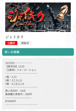 「ジャイキリ」「サーチライト」「ジースパイア」…と、似たような価格帯のプランが多くて、どれを選べばいいか毎回悩みます。結果的に選んだ「ブルーシャン」で勝てたから良かったけど、もう少し選びやすいガイドがあると嬉しいかな。的中率は文句なしです。