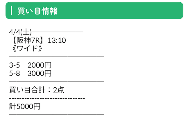 ネオスの魅力は買い目点数が少ないことです。ワイドの場合は1〜3点の予想が公開されます。そのおかげで今までトリガミになったことは一度もありません。