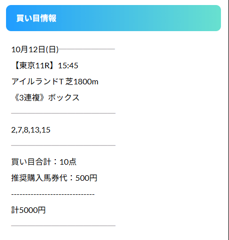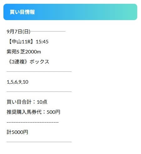 本来であれば1点100円まで下げてリスクヘッジをするべきですが、競馬戦線の軍資金は5万円と余裕があるので、推奨通り1点500円〜600円で勝負していきます。