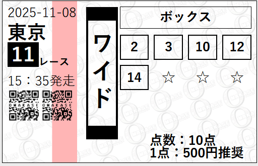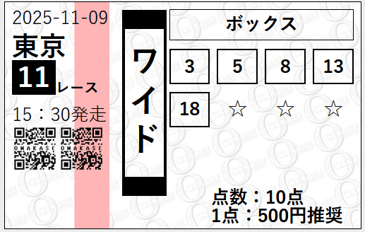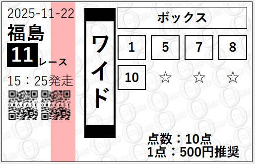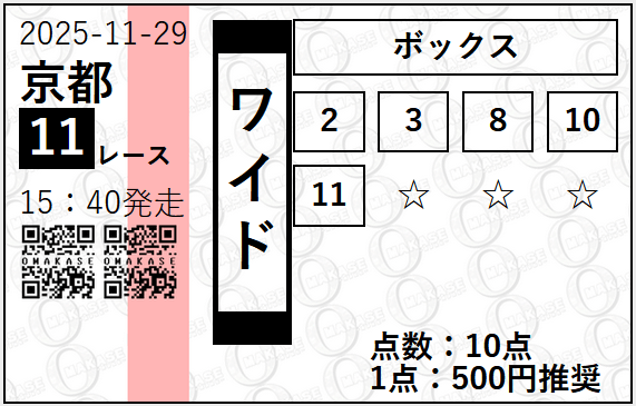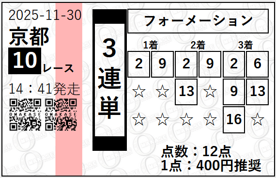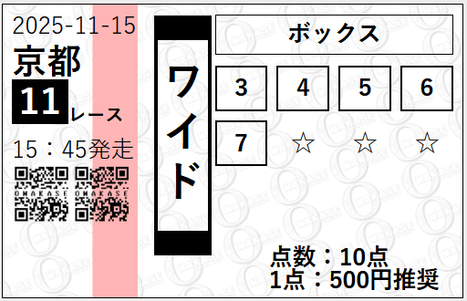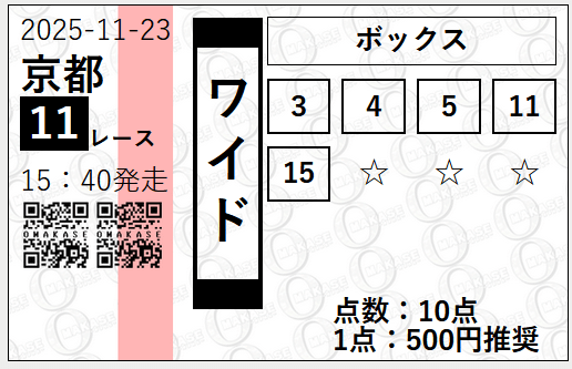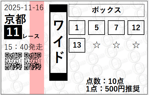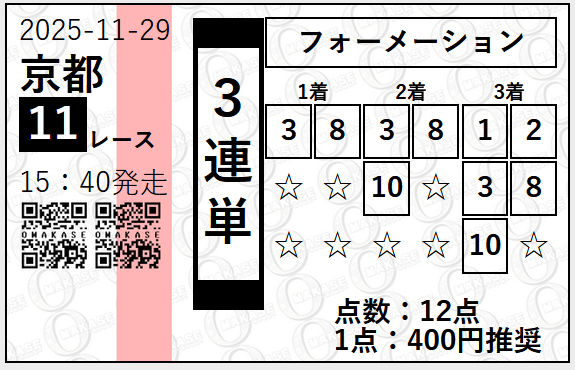 | 202511/30 | 京都10R[📷] | ⭕️ | 873,000円 |